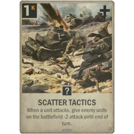 The prize for winning this Skirmish is a full set of the new German card, Scatter Tactics! This Countermeasure costs 1 Kredit to play and has the effect that when a unit attacks, enemy units on the battlefield get -2 attack until end of turn.