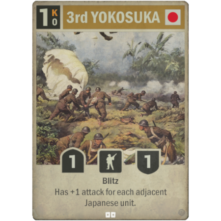 The prize for winning this Skirmish is a full set of the new Japanese card, 3rd Yokosuka! This Infantry unit costs 1 Kredit to play and 0 Kredits to operate. It has 1 attack, 1 defense, the Blitz ability and has +1 attack for each adjacent Japanese unit.