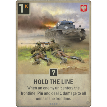 The prize for this Skirmish is a full set of the new Polish card, Hold the Line! This Countermeasure costs 1 Kredit to play and has the effect that when an enemy unit enters the frontline, Pin and deal 1 damage to all units in the frontline.