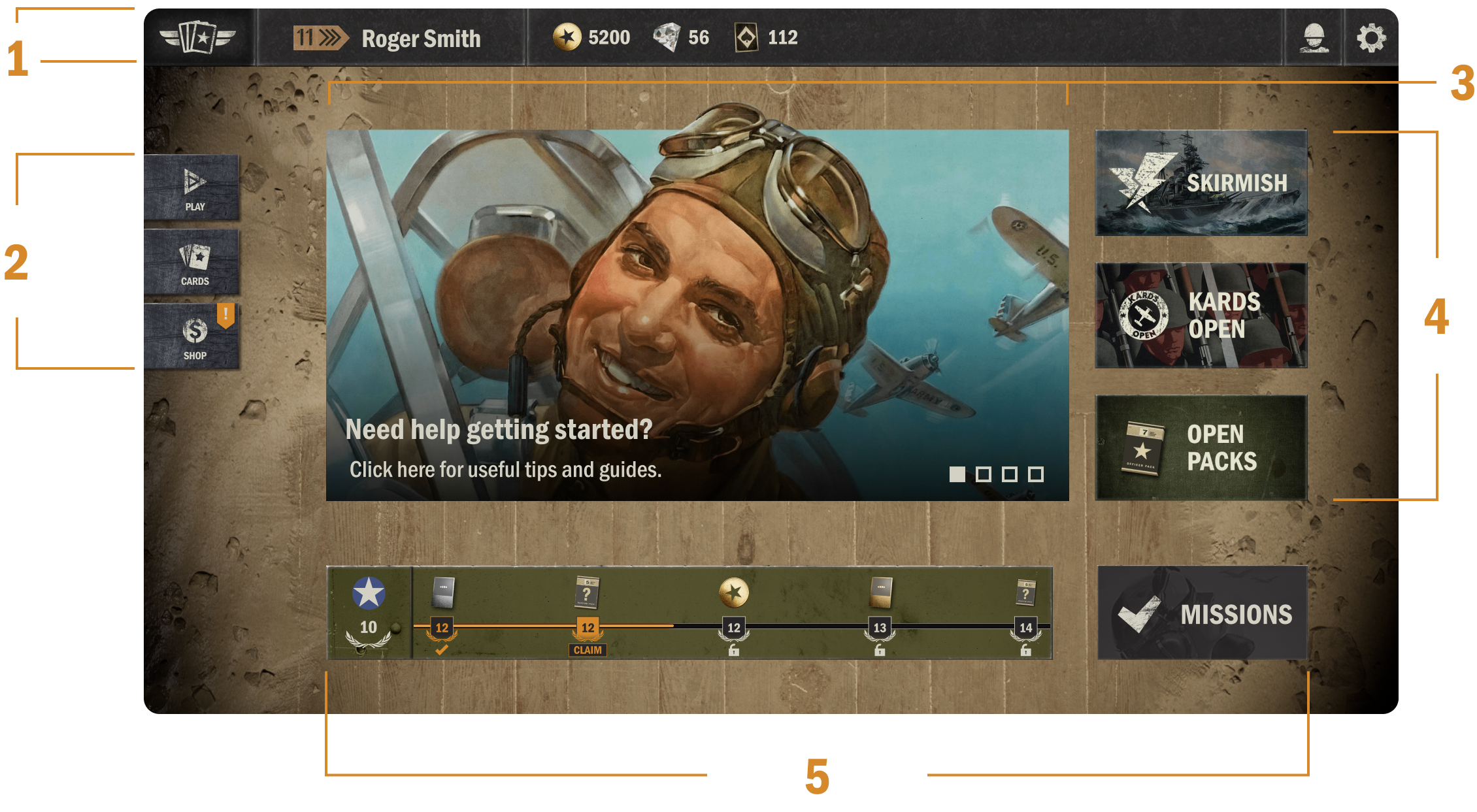 On the far left, you’ll find the Home button. Simply click on the KARDS logo to take you back to the home screen from almost any other part of the UI.