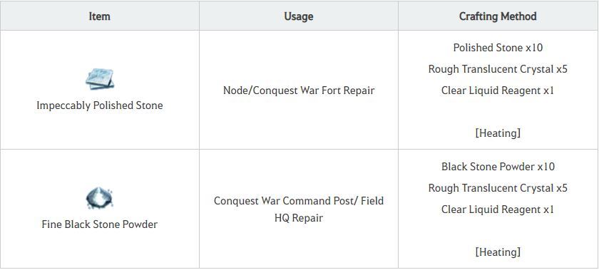 ● Added Impeccably Polished Stone and Fine Black Stone Powder to Node/Conquest War, which can be used to repair Fort/Command Post/Field HQ for a greater amount of durability.