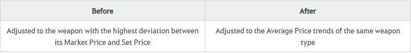 ● Changed the standard for how prices change for weapons of the same group in the Central Market as follows: