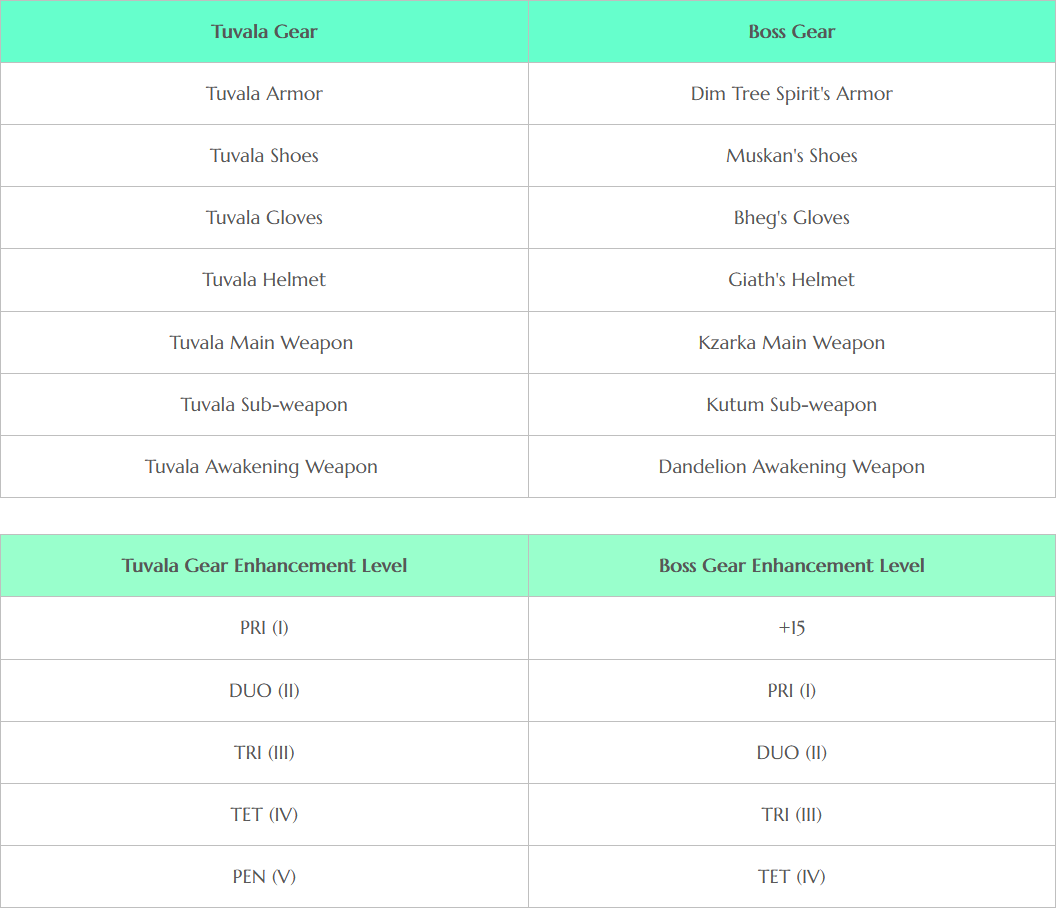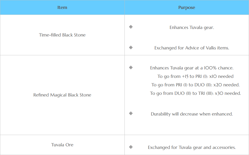 First and foremost, we wanted to keep things challenging enough to not make the progress feel empty. We especially focused on the gear available in the season servers, because getting good gear is an aspect we felt was one of the hardest challenges in our game. Therefore, we included season server exclusive "Tuvala" gear as well as special black stones. The Tuvala gear was designed to be par with the coveted "boss" gear while being easier to get and enhance. Easier, but not easy. We hope that you still can come to master this system that is so fundamental to our game.