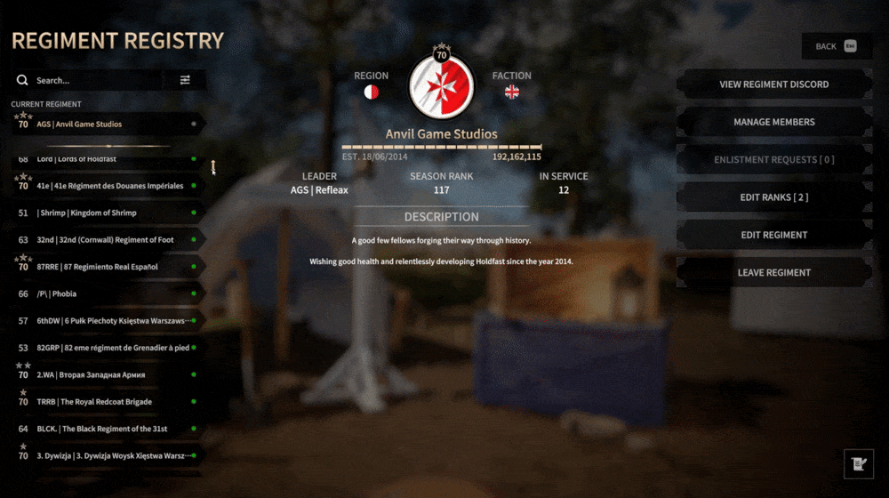 Why not take the King's 40 shillings and enlist in a regiment today? Check out the in-game Regiment Registry to get stuck in. With over 15,000 regiments registered you'll soon find a place within the ranks.