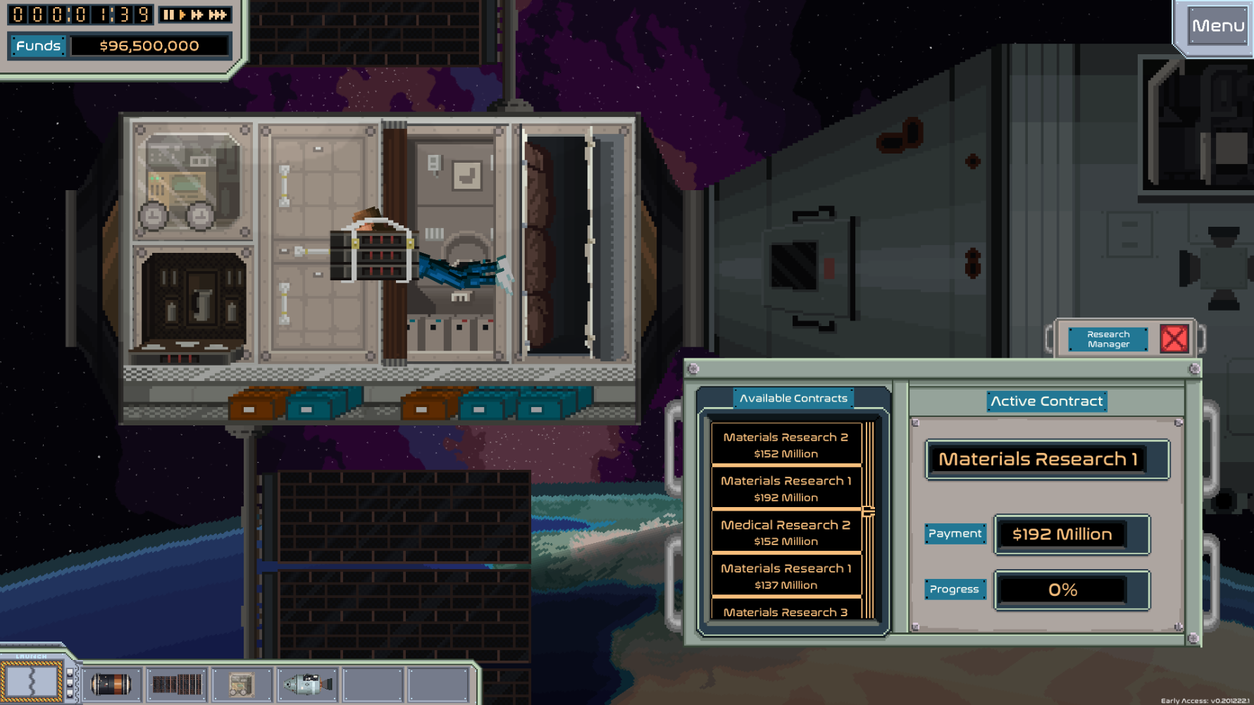 You'll need to keep your crew of Astronauts happy and healthy while they complete Research Contracts to earn money to expand your station.