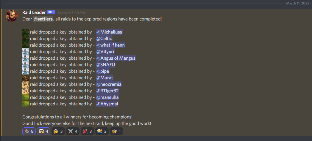While we were having a break, our settlers were doing some great work in the Discord minigame, this week's raids dropped 11 new Steam Playtest keys for our new champions! If you want to participate in the playtest please consider joining TFM DISCORD SERVER.