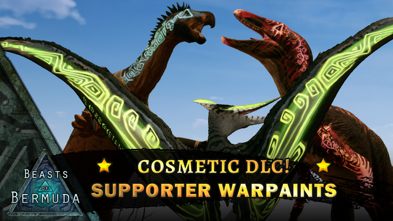 +All customizable wearables including the Supporter Warpaint overlays have a toggle for turning on and off both Diffuse and Bio +Added "No Jewelry", and "Jewlery Only" variants of all the Supporter Warpaint overlays +Variants of the base overlay type (no jewelry, customizable, default, and no jewelery customizable) will show up in a separate dropdown menu after the base overlay is selected +QoL: Equipable cosmetics can now be used on the main menu skin editor. The player just needs to join a game server at least once for their inventory to be saved locally to be then used for skin customization on the main menu. The inventory is saved in BeastsOfBermuda/Saved/local/usrsnapshot.snapshot +Updated Acrocanthosaurus, Ichthyovenator, Saichania, Apato, Megaraptor, and Pachy Supporter Warpaint to fix visual issues or improve quality +Adjusted Saturation of Mobility/Power Paints (Bases, Not Bio) 25% increase. +Saichania: Added Saichania's Wiggle Dance emote, made by Lifeon. The Wiggle Dance emote will unlock with ownership of the Beasts of Bermuda Original Soundtrack on Steam +Fixed: Shimmer color no longer gets locked after removing Warpaint overlay +Fixed: Custom warpaint glow color no longer resets to white when opening the O menu
