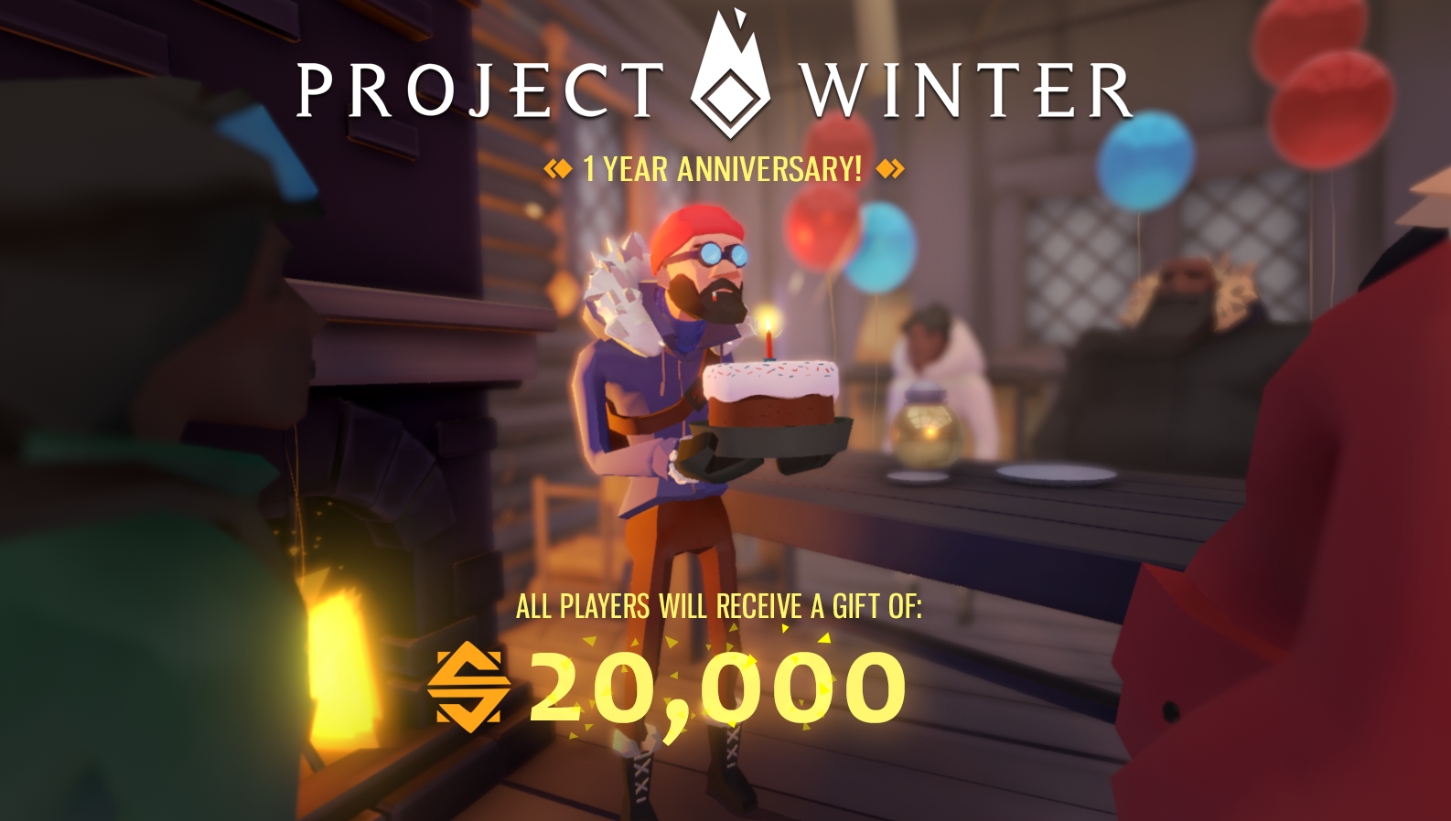 We are very pleased to announce our first anniversary celebration! Today marks one whole year of Project Winter, and as a thank you to our players, everyone will be receiving a free 20,000 Survivor Points in-game! If you log in between now and midnight, Tuesday, May 26, you can receive your reward through the in-game announcement. Be sure to log in before Tuesday at midnight! The award will only be available until then.