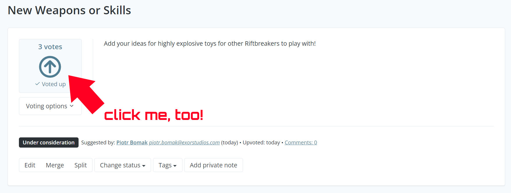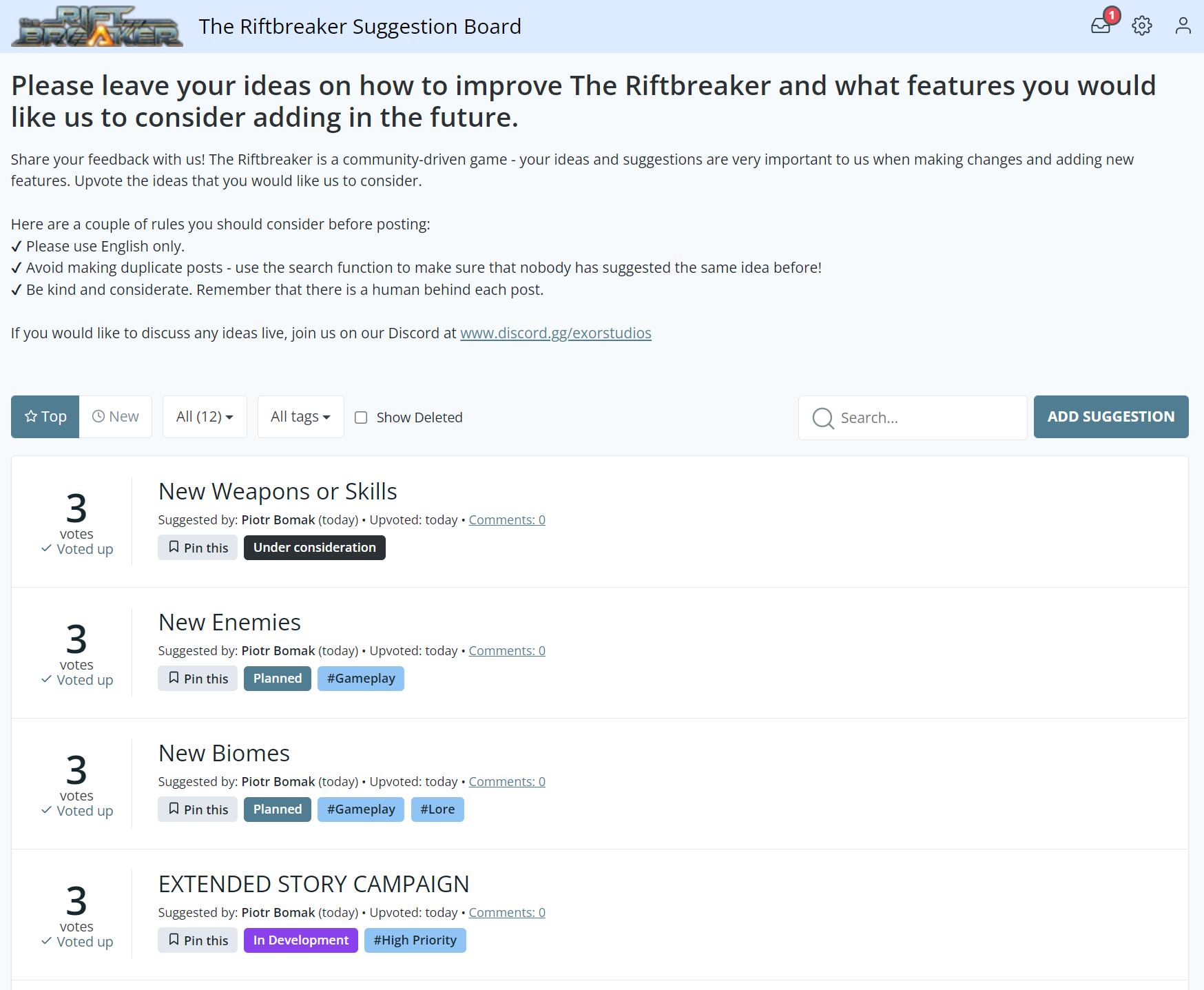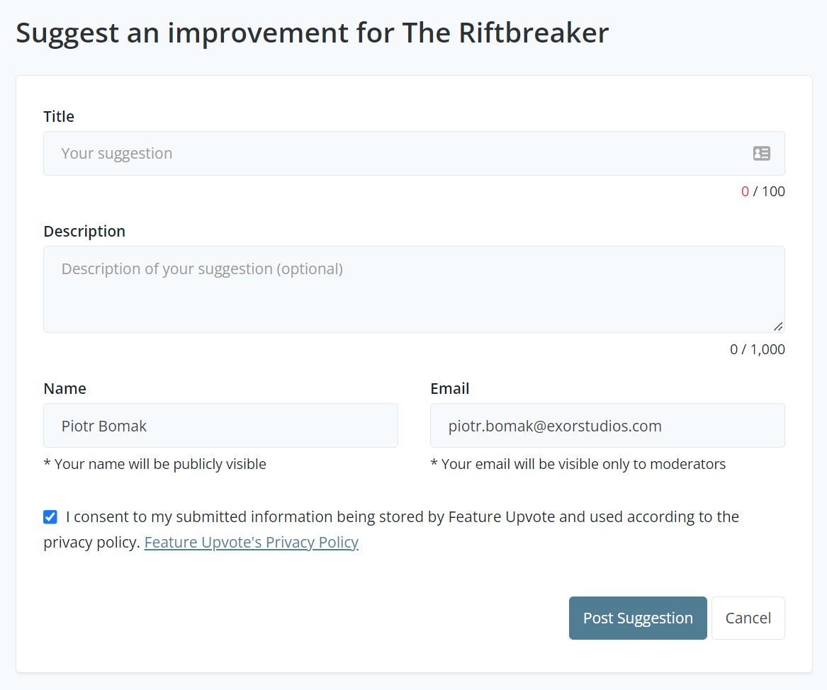 We have pre-populated the board with items from our roadmap. Feel free to upvote and comment on those - we would like to know which of our milestones and ideas are the most important to you. You can think of the Feature Upvote board as an interactive roadmap that you and other users can shape. Give it a try at https://riftbreaker.featureupvote.com.