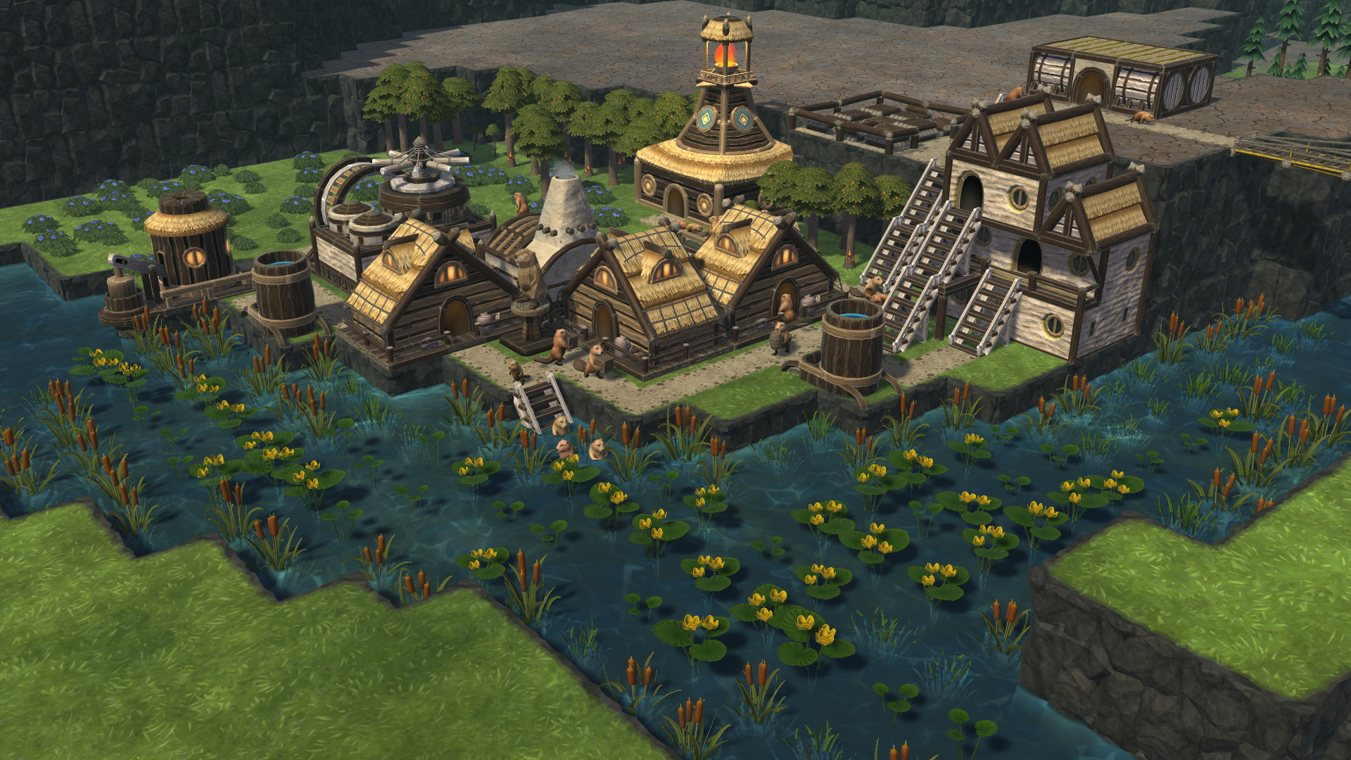 Despite evolving into a highly intelligent and industrious species, beavers can’t escape their nature - they want to live near water and need it to survive. That is the first challenge your colony will face - the suitable living area near bodies of water is rather limited, and you won’t be able to grow your city forever. At least not horizontally. In Timberborn, you can create highly complex metropolises that grow upwards, not sideways! Stack buildings on top of one another, build walkways, platforms, and bridges. Crush that population density metric!