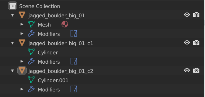 The exporter will use the names you applied to your models in Blender. Set a name for your model, for example - test_rock_01. The collisions for that model need to be named in a specific manner so that the game knows which collision belongs to any given model. You do that by adding a _cX suffix to the name like this: test_rock_01_cX, where X is the number of the collision convex. The first collision for that object gets the _c1 suffix, the second - _c2, and so on. What is essential - collision naming for each model starts from c1 and goes up!