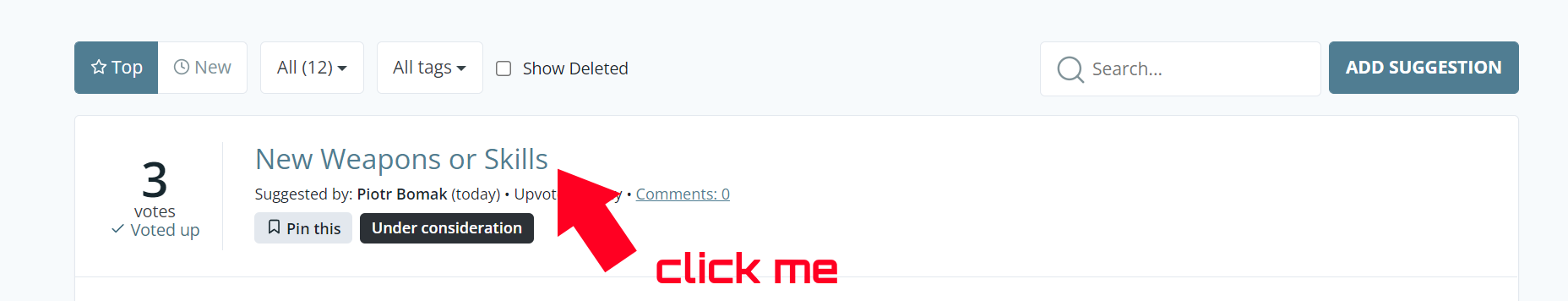 You can also add your own suggestions. Please make sure to use English! We want this board to be accessible to the broadest spectrum of users possible while maintaining relative order and quality, and this is the only way it can happen. Also, make sure that your idea is not a duplicate of another post - use the ‘search’ function. If you’ve met both of these conditions, just click the ‘Add Suggestion’ button. Give your thread a title, create a short description, and you’re good to go! As soon as we go through your post, we will assign it proper tags, and other users will be able to upvote your idea.