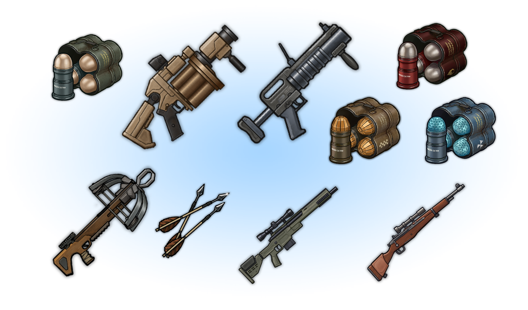 The decorative objects received an update too! There are many more of them now—and they are all in separate groups, 100% non-mandatory so they will not hinder your progress. Just a little extra for those who want it. See the image above for some examples. You will also be pleased to know that we have finally introduced grenade launchers and the crossbow along with several new long-range rifles and other small things! You can build these new grenade launchers and grenades when you reach Tier 3. The crossbow, on the other hand, is available from the very start of the game and you can craft it without using a workbench which makes it a very convenient starter weapon, though not as powerful as firearms. Another small change was a reworking of character faces and bodies. While this change is not a major one it still makes the game look substantially better! We hope you will enjoy this change as well. Most importantly, it lays down the foundation for us to introduce skin tone and hair color changes in the future updates as these new sprites are already designed to work with this new system in mind.