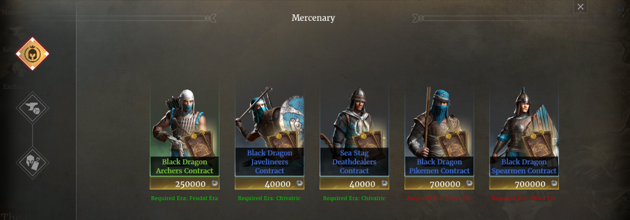 1.Mercenaries unit recruit During past two months, Warlords from different regions in Conqueror's Blade: Frontier were super active in the market, making silver coins become the hard currency in the game. Now the recruit for Mercenary of Commander Adler in Boderlands also will be available in the market. As the best elite mercenaries unit, Mercenary of Commander Adler also have a relatively higher price. Now Warlords can use silver coins to recruit mercenaries unit in War Scholar. Relevant prices are as follows: ---Black Dragon Arches: 250,000 silver coins ---Black Dragon Javelineers:400,000 silver coins ---Sea Stag Deathdealers: 400,000 silver coins ---Black Dragon Pikemen: 700,000 silver coins ---Black Dragon Spearmen: 700,000 silver coins