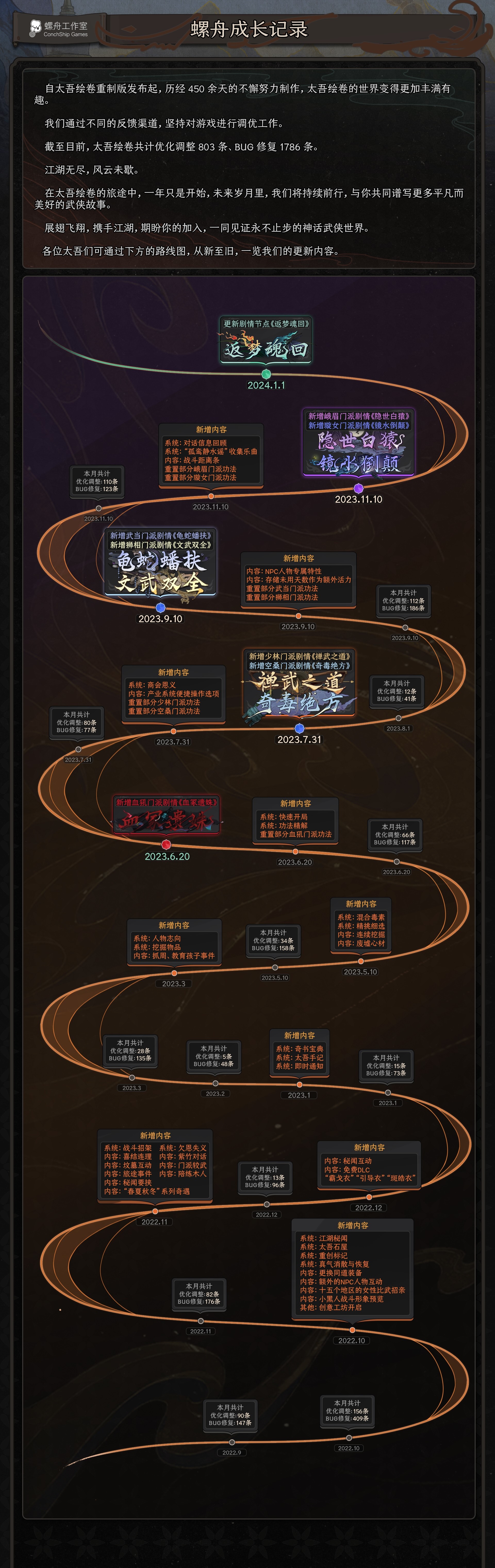 随着梦回内容的初步实装,我们也在不断努力制作后续的主要剧情和玩法,期待能更早的向大家揭示太吾世界的真相,