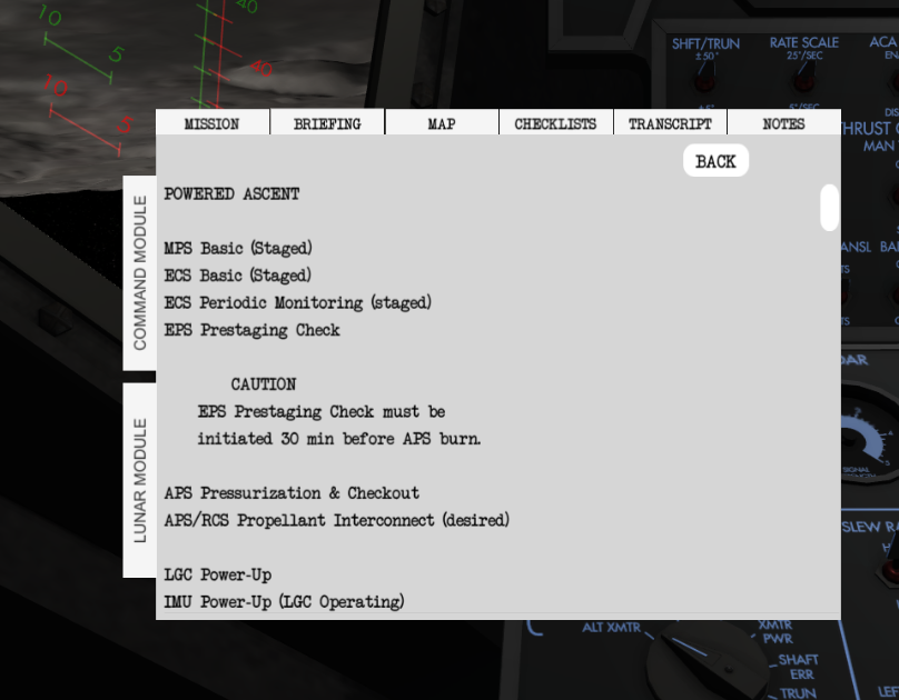 Lunar Ascent & Rendezvous For those familiar with the Lunar Ascent and the LM/CSM rendezvous will know that this is a complex operation. There are a lot of procedures involved, and many new systems will be used. In addition, you will need to control two spacecrafts at the same time. The LM during ascent, and the rendezvous burns, and the CSM for docking, and during the rendezvous burns.