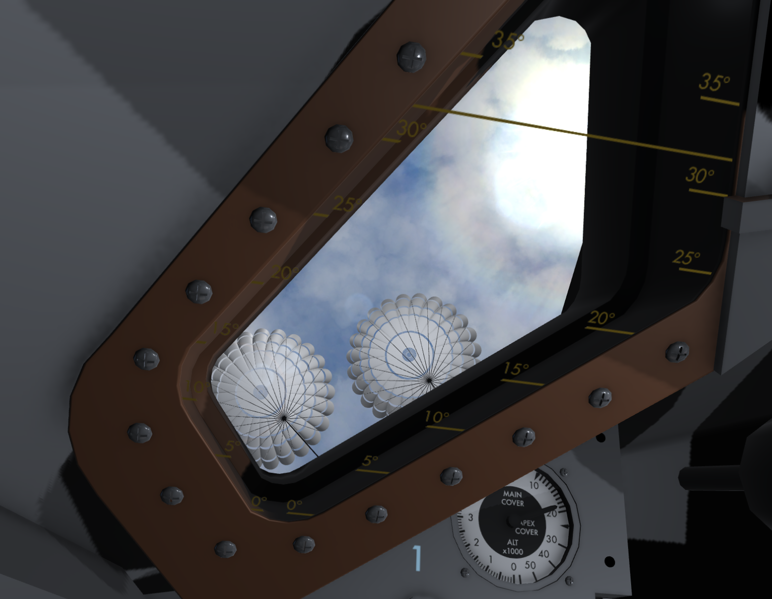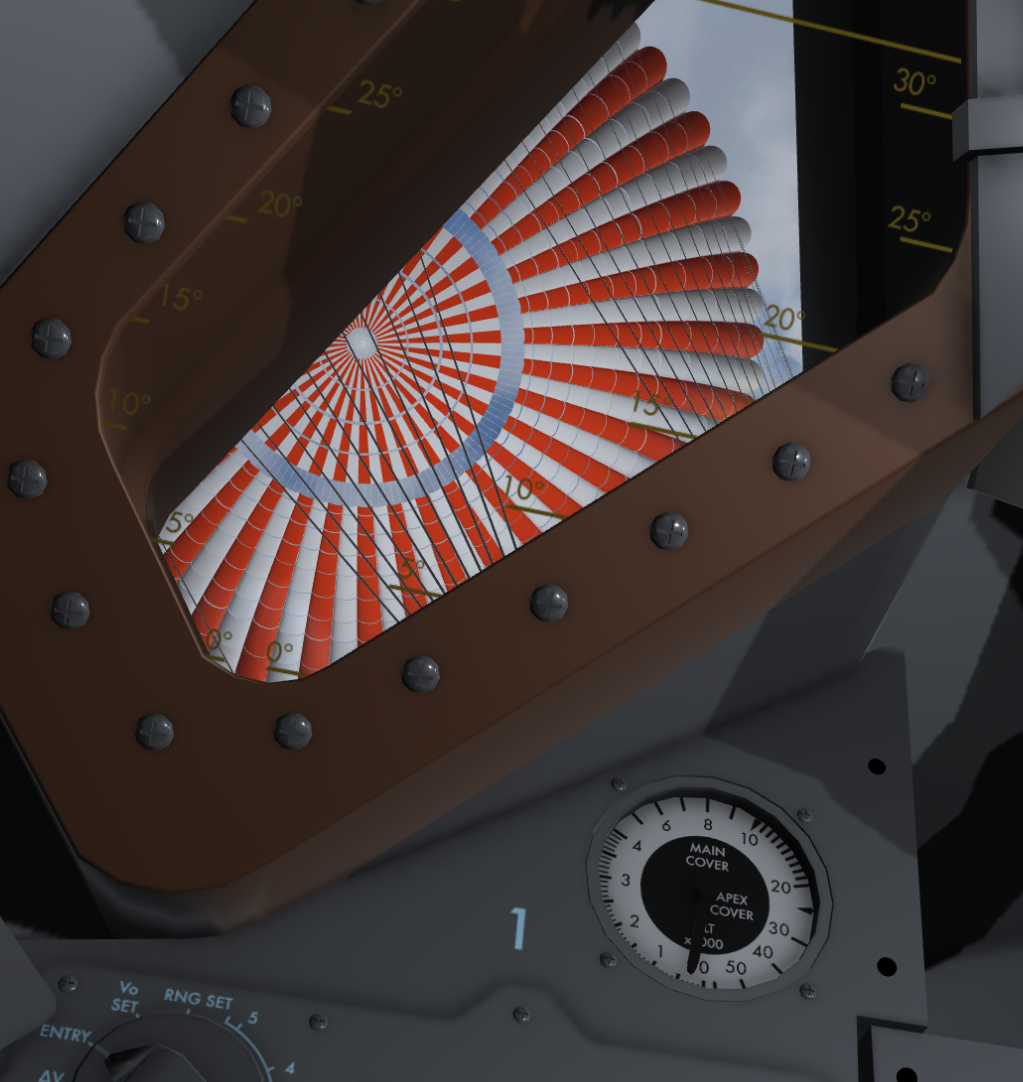 First thing you will see is the release of the APEX cover, shortly followed by the two drogues. The descent rate should slow down to about 200 ft/s or less, and the capsule should stabilize/hang from the two chutes. Do not use the RCS system at any time during landing, or the ropes will burn.