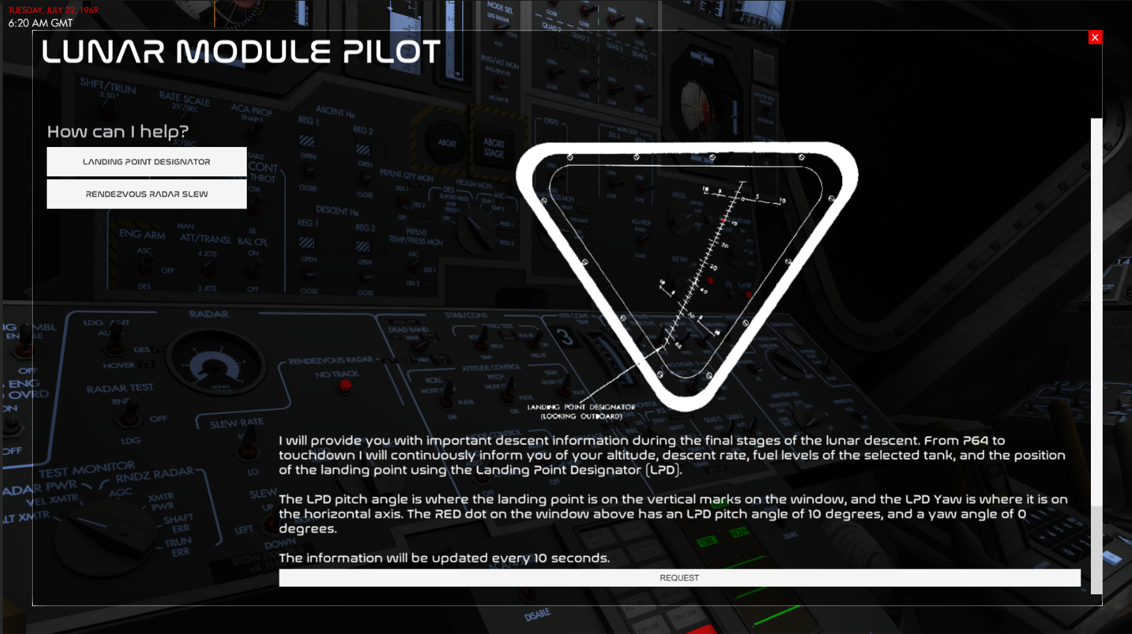 New Apollo Co-Pilot view The new co-pilot screen allows you to give commands to your fellow crew members. You can ask the Lunar Module Pilot to guide you during the LM powered descent, or help you slew the rendezvous radar. Each of these features are tools and aids to simplify some tasks, and will used dedicated UI items. More features will be added.