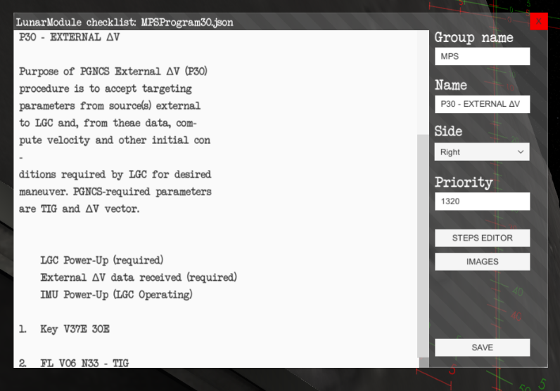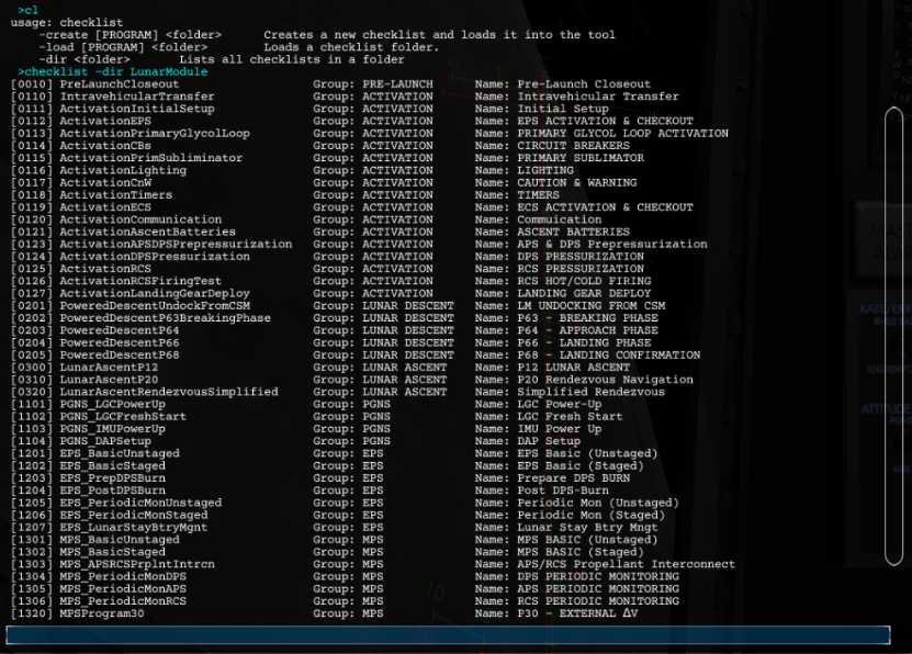 New checklist system The entire checklist system in Reentry has also been replaced by a new system. It looks similar to what you are used to but is now fully file-based. This means that each checklist has a dedicated file on your computer. A new checklist editor accessible using the in-game console can be used to add your own checklists, as well as modifying existing ones. When a mission is loaded, the checklist tabs of the Mission Pad will be procedurally generated based on the files it finds, and their data.