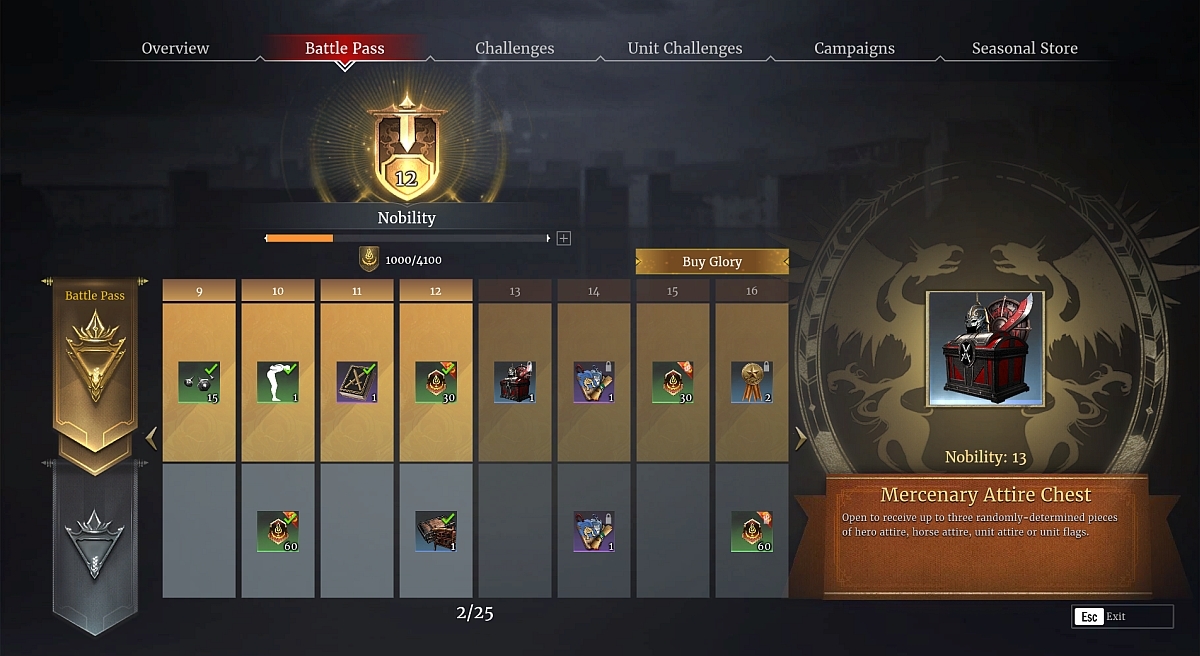 Challenges: Each week of the season comes with its own set of challenges. Complete them to receive the Glory needed to increase your Nobility ranking and receive the maximum amount of rewards!