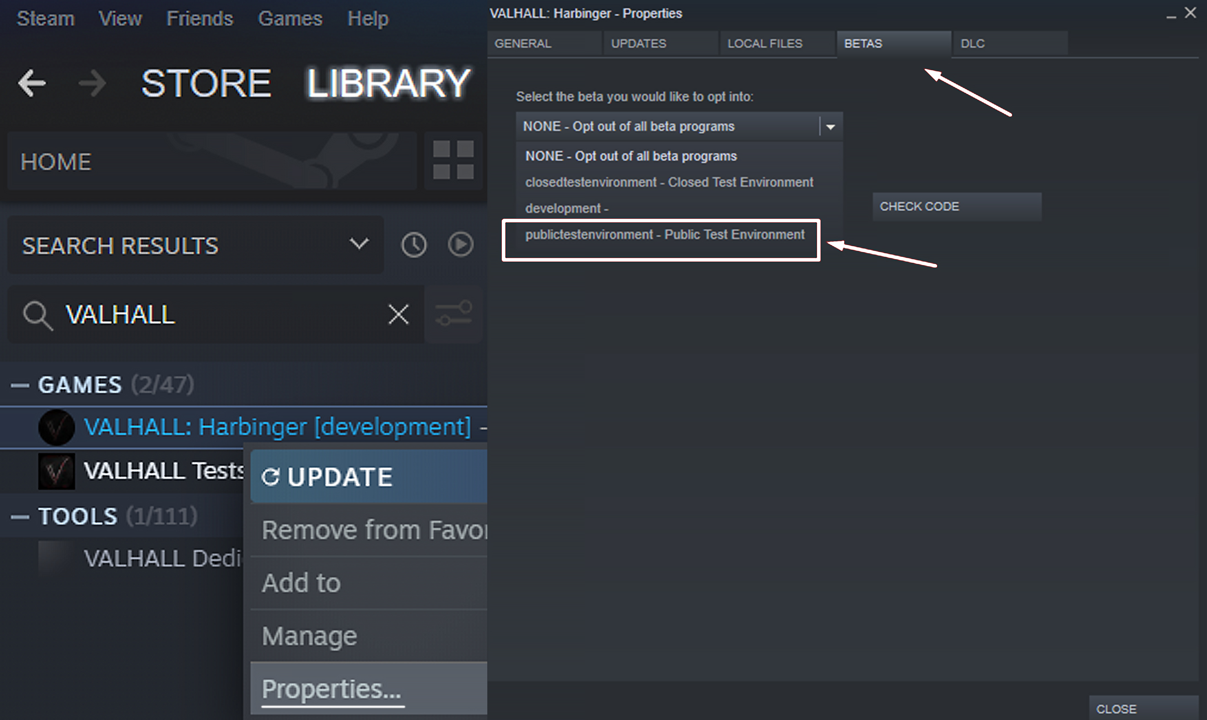 Right click on VALHALL in your Steam library, click "Properties". Then go to "Betas" and select "publictestenvironment" from the list. Steam will download the branch for multiplayer testing. If you want to revert to a single, select the default branch in the properties. This is a temporary measure. [/b]