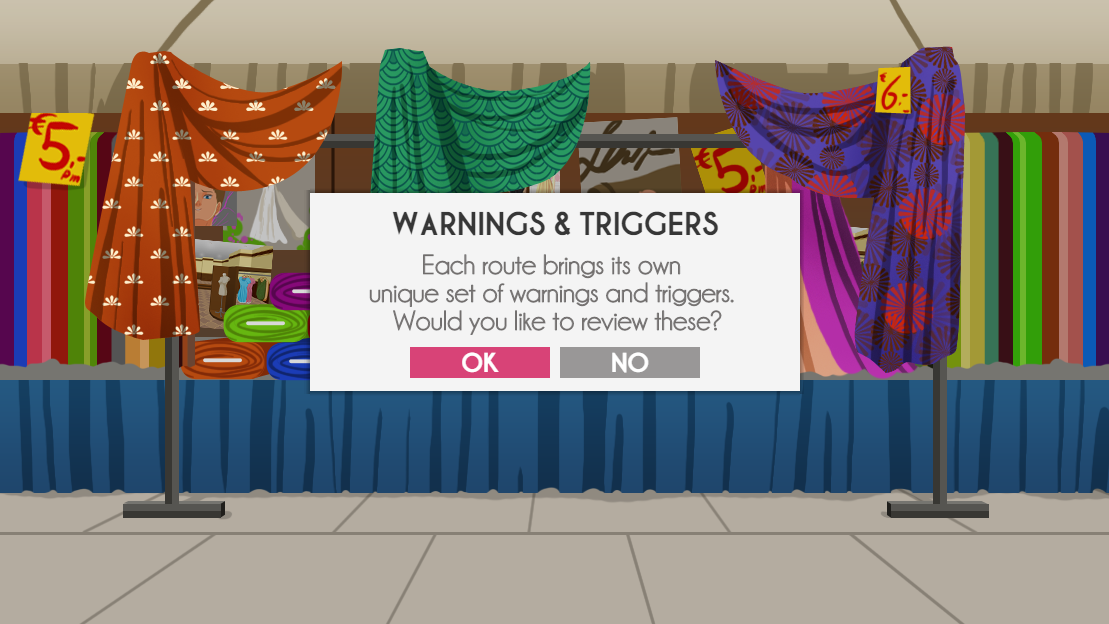 A trigger warning screen before you start each route, with the option to skip. Heavy spoiler warnings are hidden behind a wall, so no worries - you won't be spoiled if you are curious to check out the regular warnings.