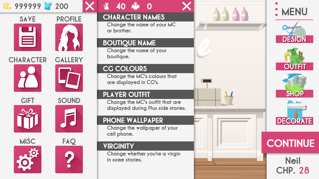 Content - Caine's full route has now been added (5 hours of content) - James' 1st chapter can be previewed (go to chapter selection, then reread his 1st chapter) - A whole bunch of new clothing accessories are now available - New clothing styles for tops and skirts have been added - Geometric shapes are available as details - Lots of new patterns to use - New wallpaper, flooring and furniture to customize your boutique - MC now has a sprite that has been added for side stories told in the love interest' point of view (Plus users only)