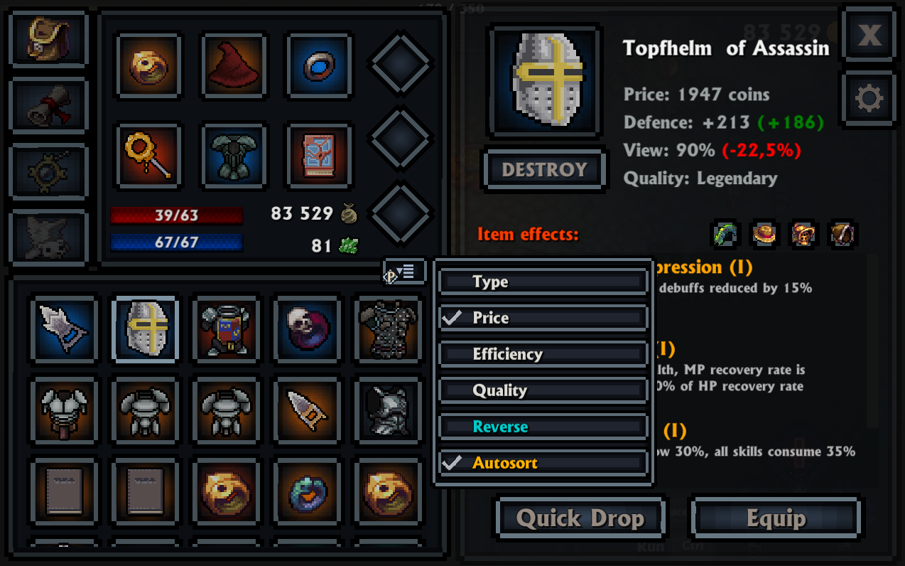 [Gameplay] - Items in the inventory can now be sorted by type, price, efficiency and quality
