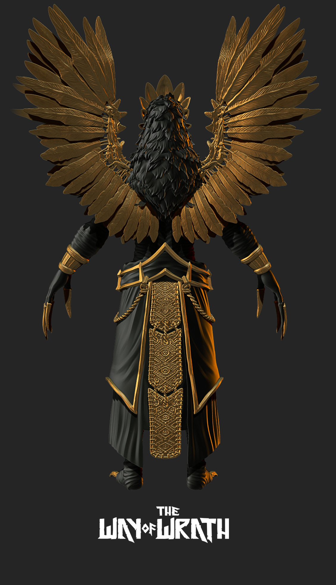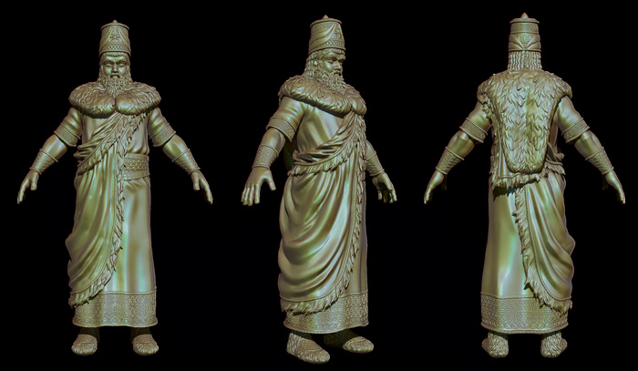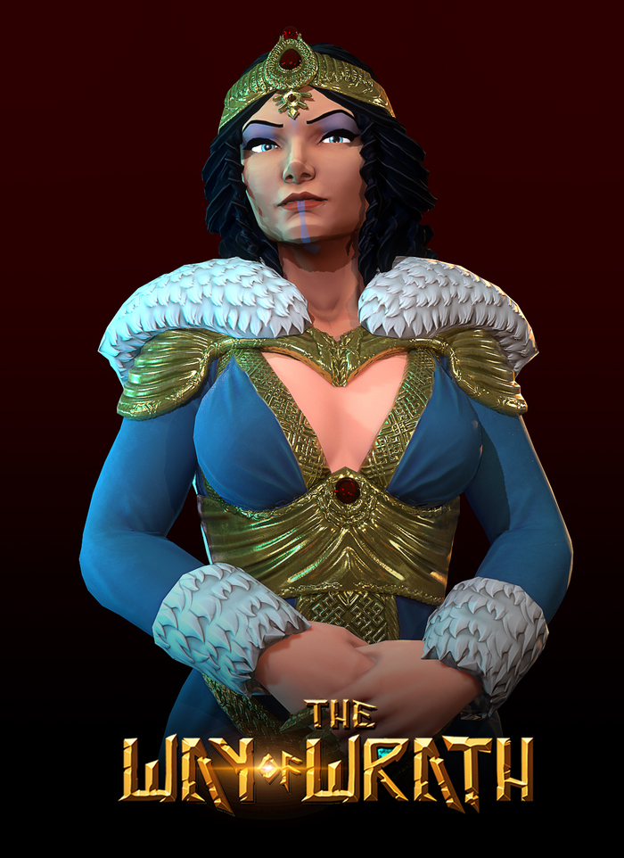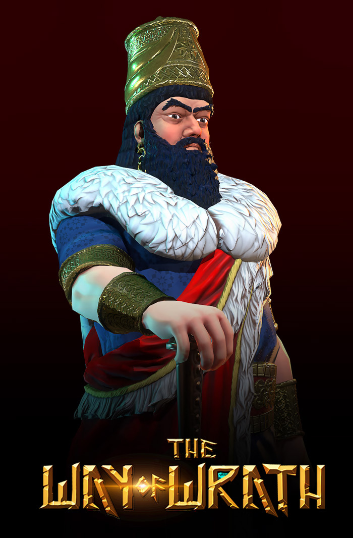 His attire, hair, and adornments echo the dawn of metallurgy, when gold and bronze were just beginning to shape the world of rulers and warriors. The colors of his garments hold deeper meaning—his flowing blue robes symbolize his unyielding will for freedom and greatness, vast and limitless like the sky. Draped over this, his crimson cape is the mark of his wrath, a symbol of retribution against his enemies and the unbreakable strength of his warrior soul.