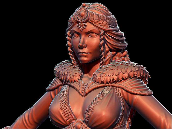 She wears a regal deep blue dress, the color of wisdom and the boundless sky, adorned with intricate gold and copper details that shimmer like fire under the sun. Around her forehead, she wears a golden diadem crowned with a massive red ruby—its fierce glow a testament to her unbreakable mind. A second ruby, just as grand, rests over her heart, set into the very fabric of her dress. These twin gemstones are more than mere adornments—they symbolize the duality of her soul. The ruby on her brow signifies her brilliant, strategic mind, always calculating, always watching. The one at her heart represents the depth of her emotions, the fiery passion that guides her in matters of loyalty, love, and counsel.