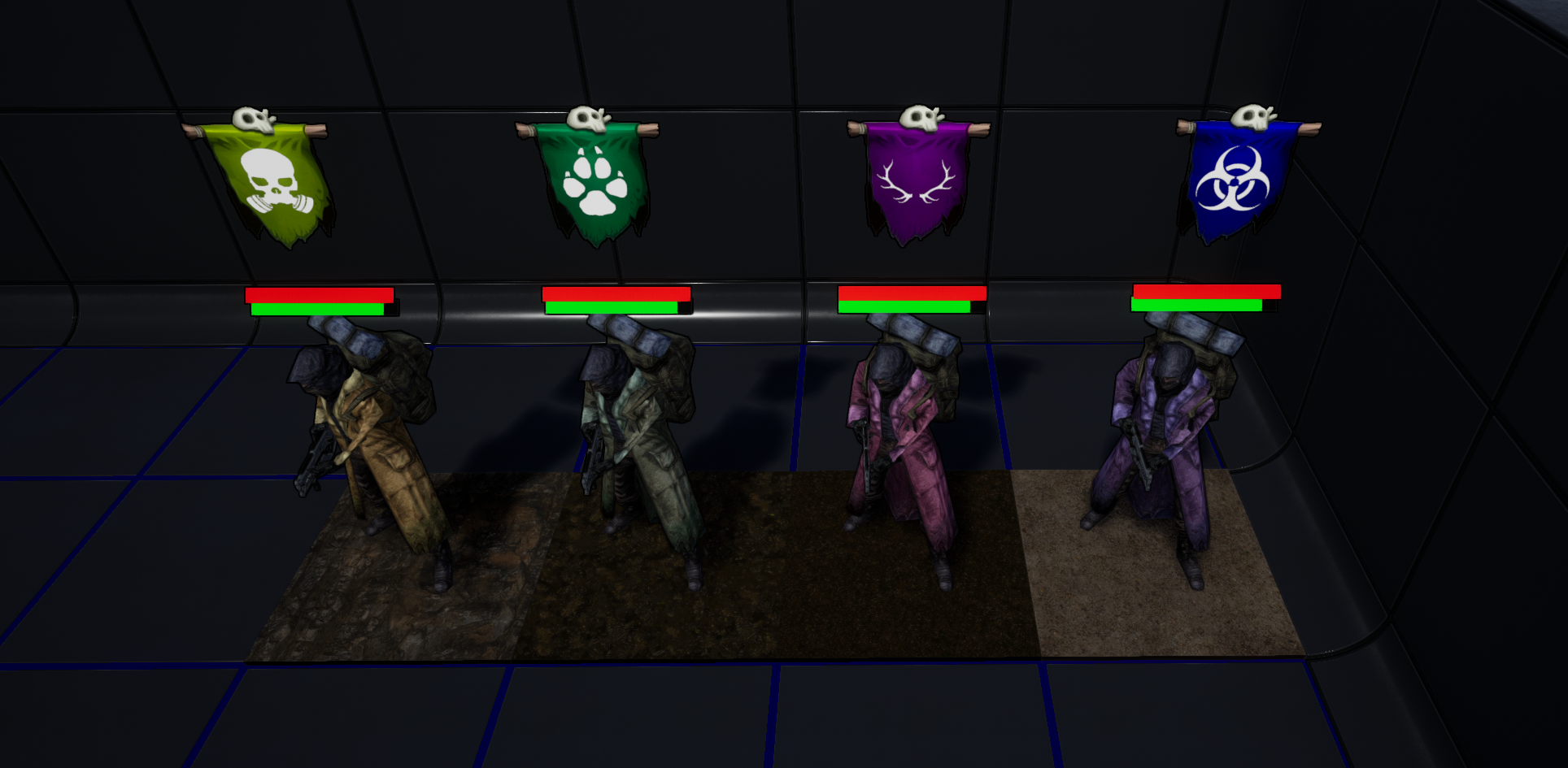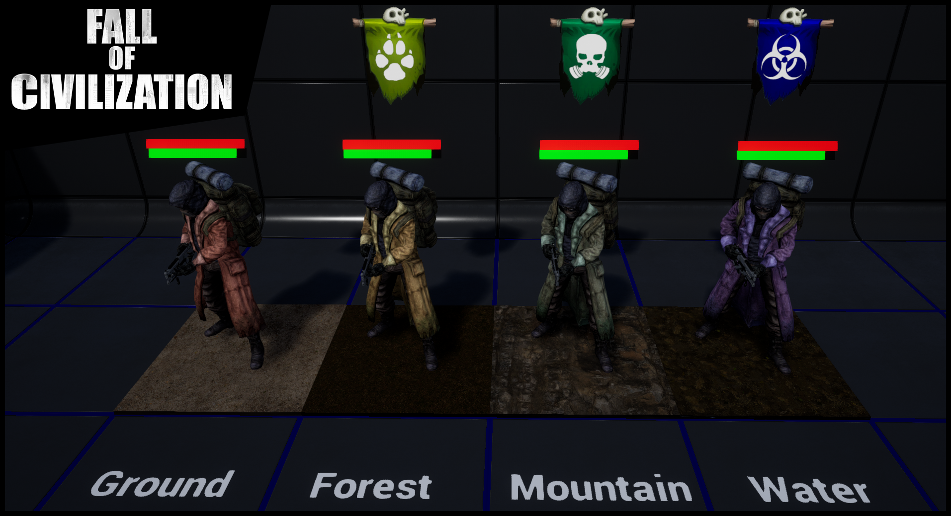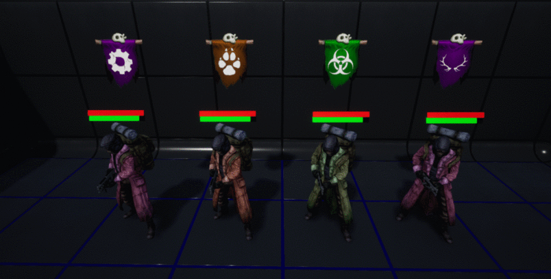 So all units, bases and structures will have a banner looming over them to identify their faction color and their faction symbol. I will possibly/probably be looking to change the symbols I have so far in the near future for something cleaner and more consistent. Aswell as this you may also noticed two other key details of the update, the survivor unit changes clothing color based on their faction and they are standing on some labelled terrain tiles. These tiles are not finalized versions yet but a step in the right direction away from placeholders. They look quite bland now understandably but will look more lifelike once props are added such as (Trees, rocks, lakes, buildings and more)