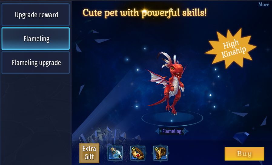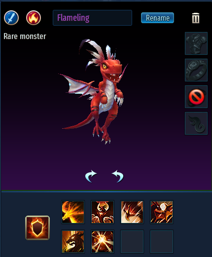 Initially, the Flameling is able to use 2 skills: Basic Dragon Executioner and Basic Naga Frenzy. As its owner continues to level up, so will the tiny dragon uncover new hidden powers and upgrades: