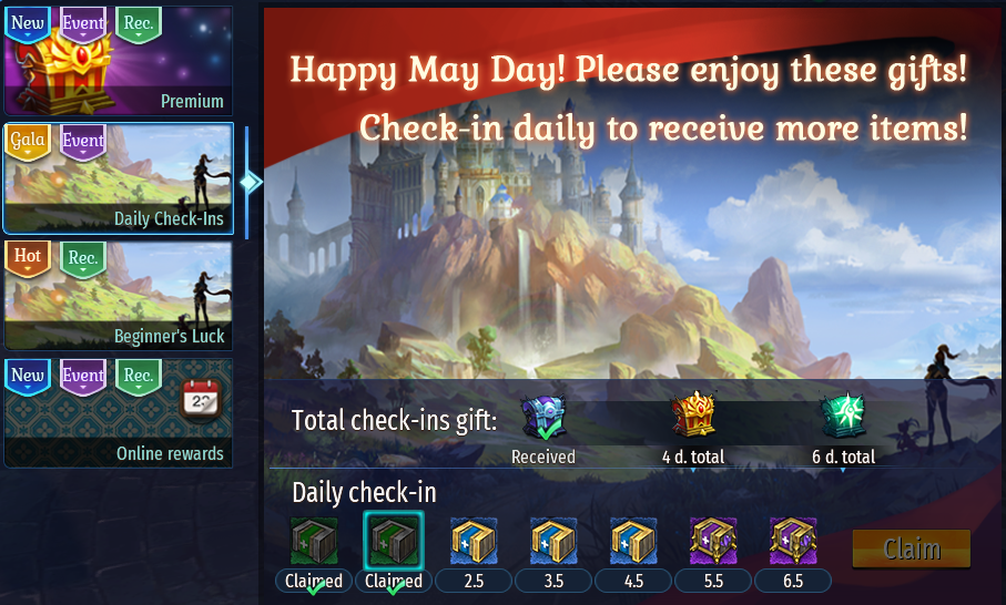 MAY DAY EVENTS Check into the game every day from April 30 until May 6 to collect valuable gifts! Upon claiming your second, fourth, and finally sixth rewards more goodies will become available in the form of Total Check-ins packs. In addition to regular items, these chests also include lots of Gardener tokens for the current Tree Spirit event.