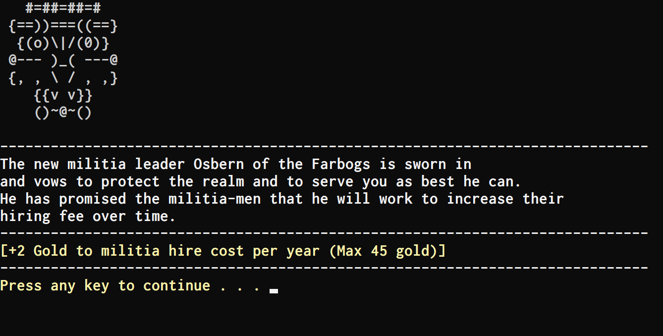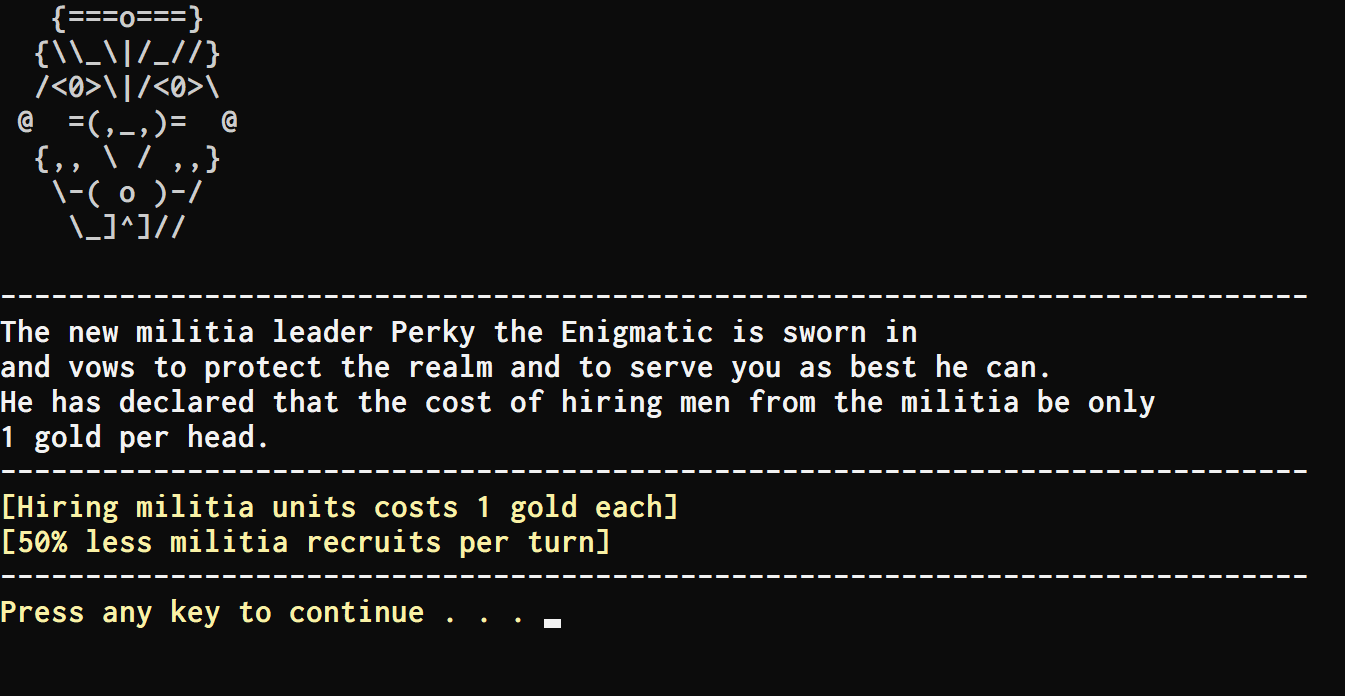 Previously the militia, your main source of peasant hired recruits and sometimes a valuable defense assistant had little in the way of randomisation. The militia unit price would vary game to game and change over time and the leader of the militia always had a unique face and name but beyond that there was very little in the way of unique change. Now there are 20 different traits that the militia leaders can have, these vastly impact the militias functionality and variation.