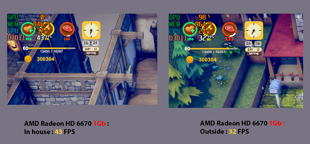 Old VGA: Tested AMD Radeon HD 6670 1Gb : 43 FPS (in house) - and 32 FPS (in farm)