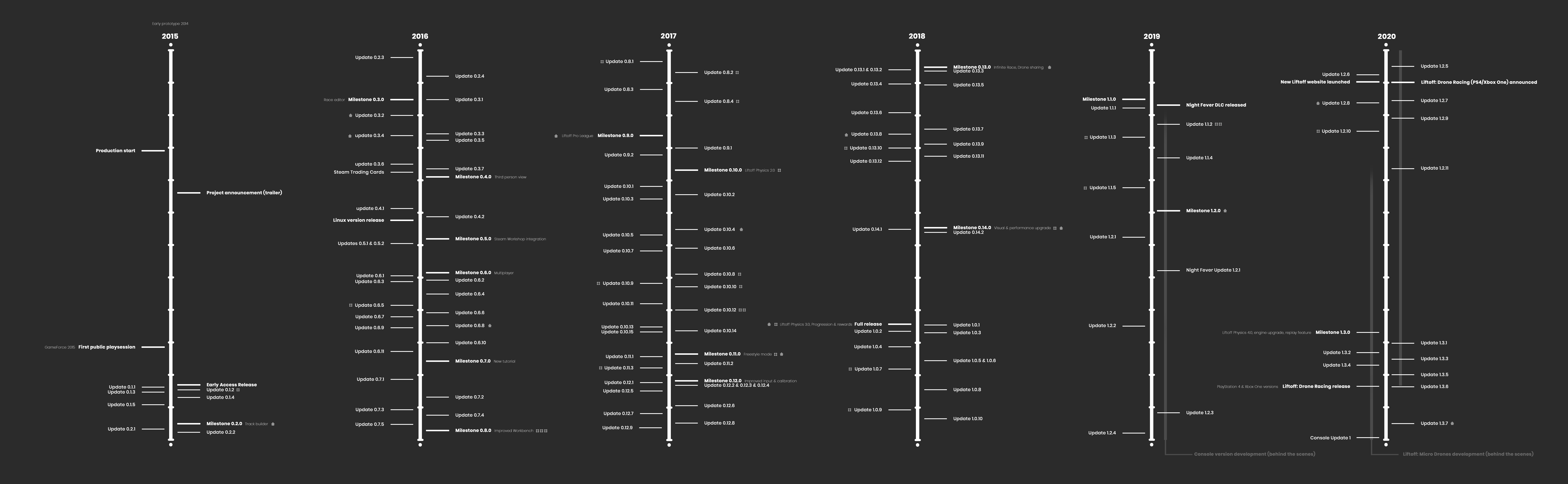What can we say? 5 years in and yet 2020 has proven to be one of our biggest years so far! Not only did we release a Liftoff game on PlayStation4 and Xbox One (a massive milestone for the team), but we've also continued to make Liftoff on PC the absolute best FPV simulator it can be. Â Here's an updated development timeline.Â
