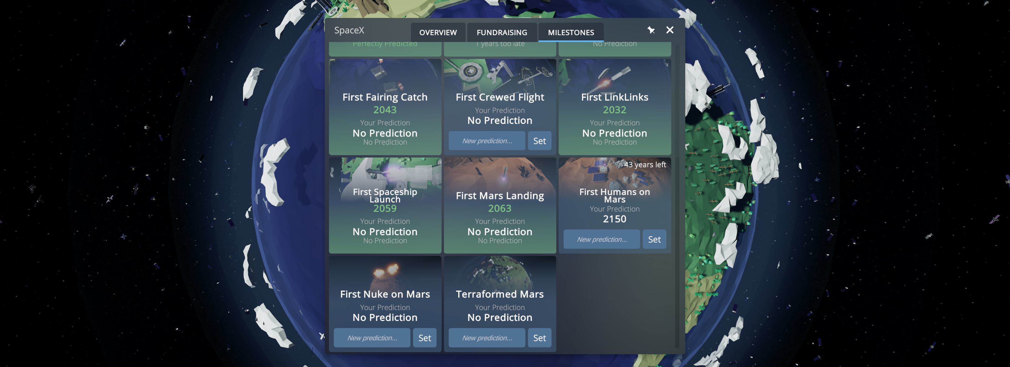 To make EarthX more interesting to play, you will be able to set up your own predictions/timelines in the Milestone Tab (Company Window). Be Elon Musk haha