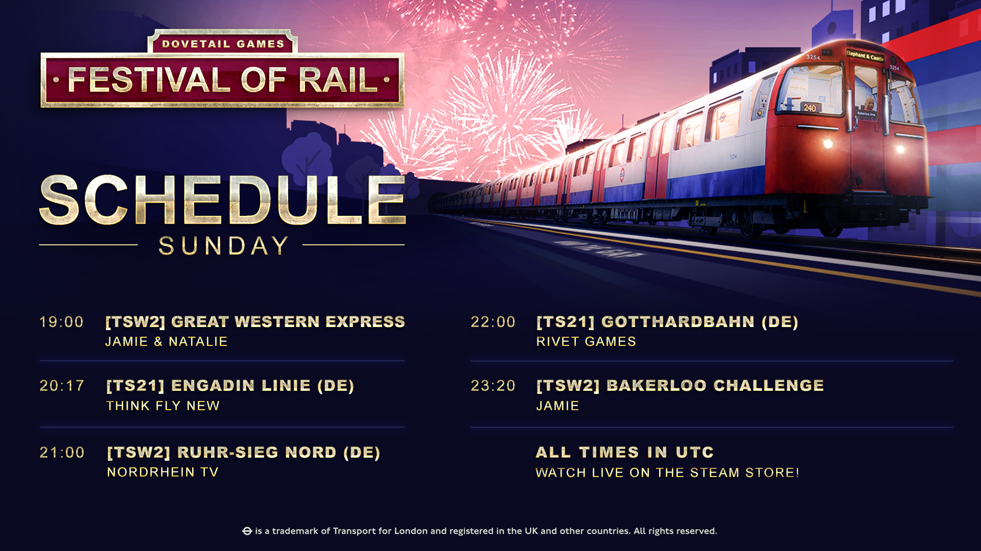 Join us for the final broadcast of the Festival of Rail, live on the Steam Store. In today's lineup you can look forward to the finale of our Bakerloo Challenge as well as an exclusive German language section with videos from NordrheinTV, Think Fly New and developer Rivet Games.