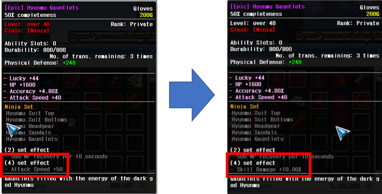 3. Assassin 40 Level Equipment set effect has been changed [Attack Speed → Skill Damage].