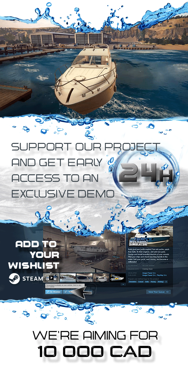 :TOsteeringwheel: Special thanks in-game credits :TOsteeringwheel: Special title on our official Discord server :TOsteeringwheel: Access to Yacht Mechanic Simulator 2021: First Contract ahead of its release on Steam :TOsteeringwheel: Priority access to a Steam demo of the game (until February 10, and then it will be visible publicly on Steam) :TOsteeringwheel: A bundle of Kickstarter-exclusive wallpapers :TOsteeringwheel: An extra, Kickstarter-exclusive steering wheel :TOsteeringwheel: Your chosen name will appear in missions for all players :TOsteeringwheel: A poster of your design that all players will see in their shipyard :TOsteeringwheel: Your designed elements added to the game for all players to use :TOsteeringwheel: Design and name your own yacht