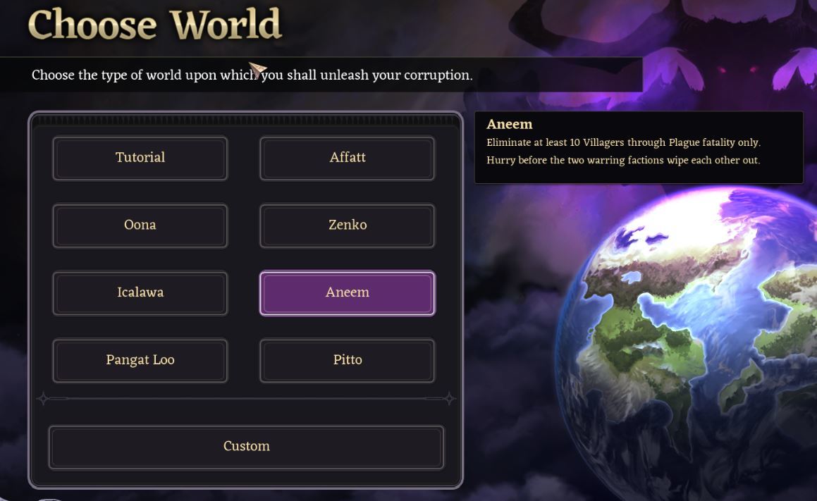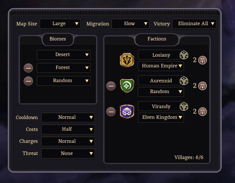 We've introduced some additional gameplay setting options to our Custom Games. Changes include: - instead of selecting number of regions, choose between different Map Sizes. The Map Size dictates the maximum number of regions, starting factions and starting villages - specify the starting faction's Faction Type, Name and VIllages - set the Biome of the map's different regions - modify various difficulty settings such as Cooldown Speed, Mana Costs, Ability Charges, Generated Threat and Villager Migration - choose Sandbox mode if the player does not want the game to end when there are no more villagers