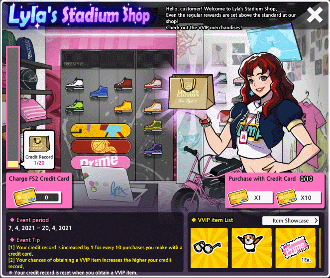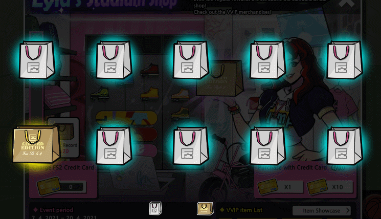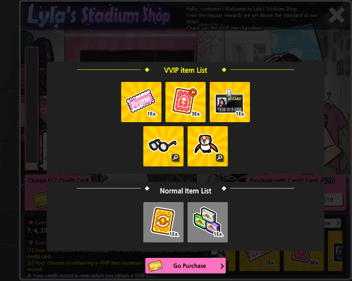 * Your credit score is increased by 1 for every 10 credit card purchases you make. * The higher your credit score, the higher chance of getting a VVIP Item. * Your credit score will reset once you obtain at least one VVIP Item.