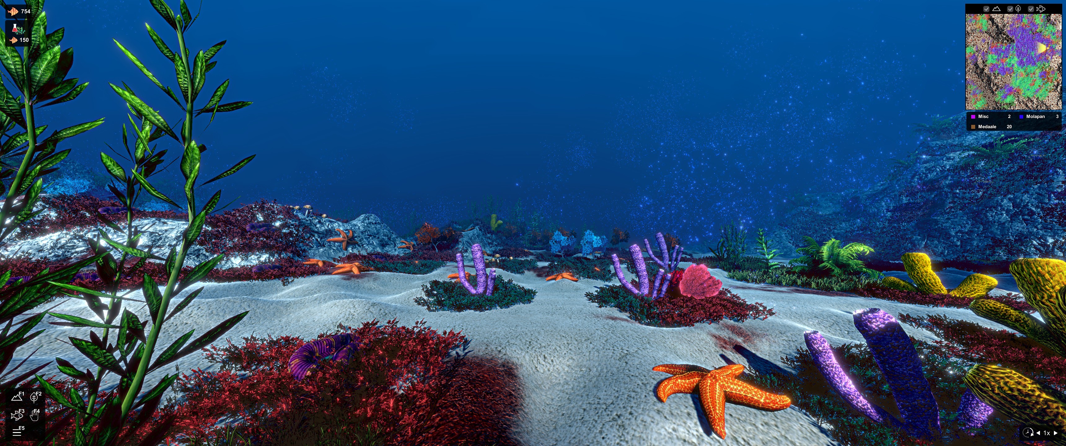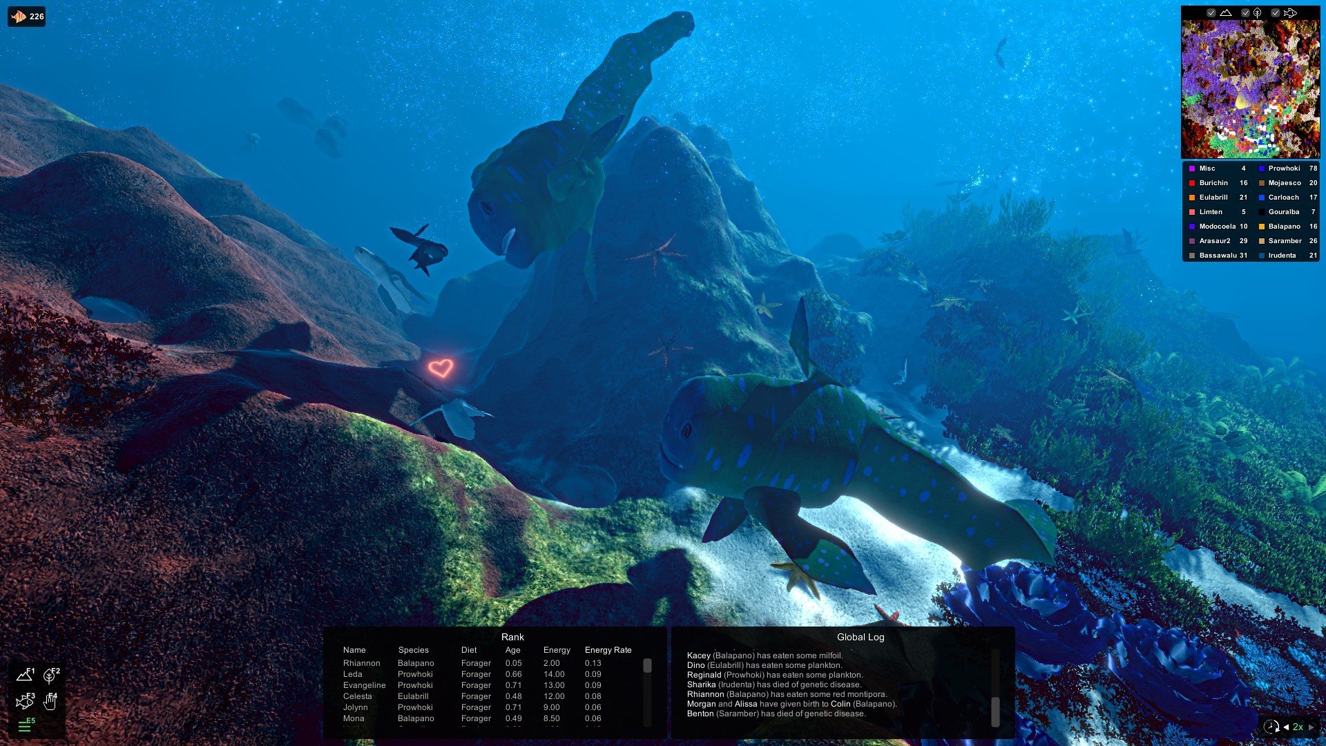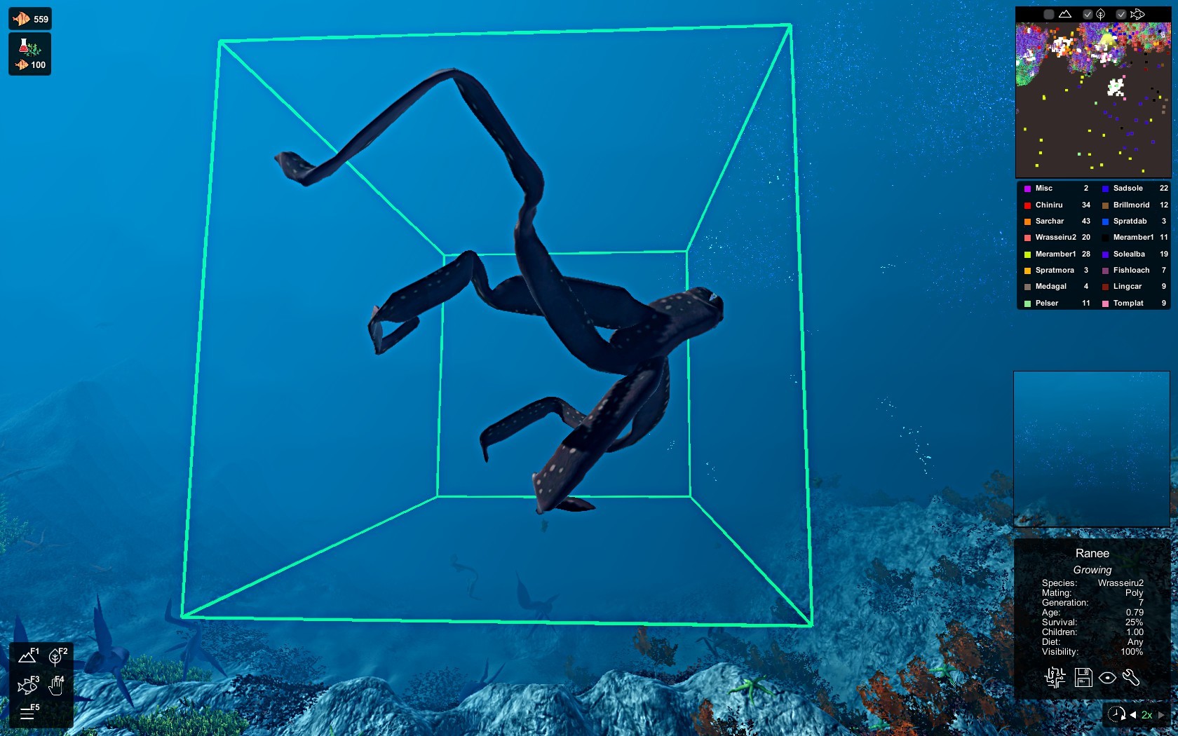 Also coming soon are displays aimed to help pinpoint what kind of niche each species occupies and how that is changing. This will include charts of its overall diet and most common causes of death, along with info panels with every trait I can think of that might influence its fitness. It will also feature a few ways to interact with entire species at once: adjusting the mutation rate of each species, setting soft population caps, setting population minimums under which a species will not be preyed upon, and removing entire species at once. The most important visualization is yet to come though: the phylogenetic tree, which should allow for a full evolutionary history of creatures in the ecosystem, allowing you to trace all the way back to the dawn of life. If it is possible, I hope to allow for zooming all the way in to the level of the individual creature, pinpointing when key mutations occurred and the effect that they had on the individuals who carried them, whether they led to success or ruin.