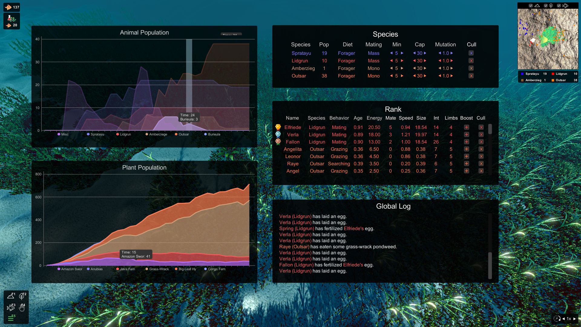 I am currently reworking the ranking and history menu (opened via the F5 key) into a suite of information displays. It will include charts of animal and plant populations over time, which can be zoomed into or out of, and which also allow for toggling the display of the different species, to let you focus on just the information that is pertinent to what you're interested in at any given moment. If a plant or animal goes extinct, this should help with the investigation into why, and by analyzing trends in the data, you should be able to see if trouble is coming and act to prevent it. There tend to be interesting alternating sinusoidal curves as you go down the food chain, with crests of prey population leading to crests of predator population as its food supply booms, which then leads to valleys in the prey population as the large predator population feeds upon it, and so on.