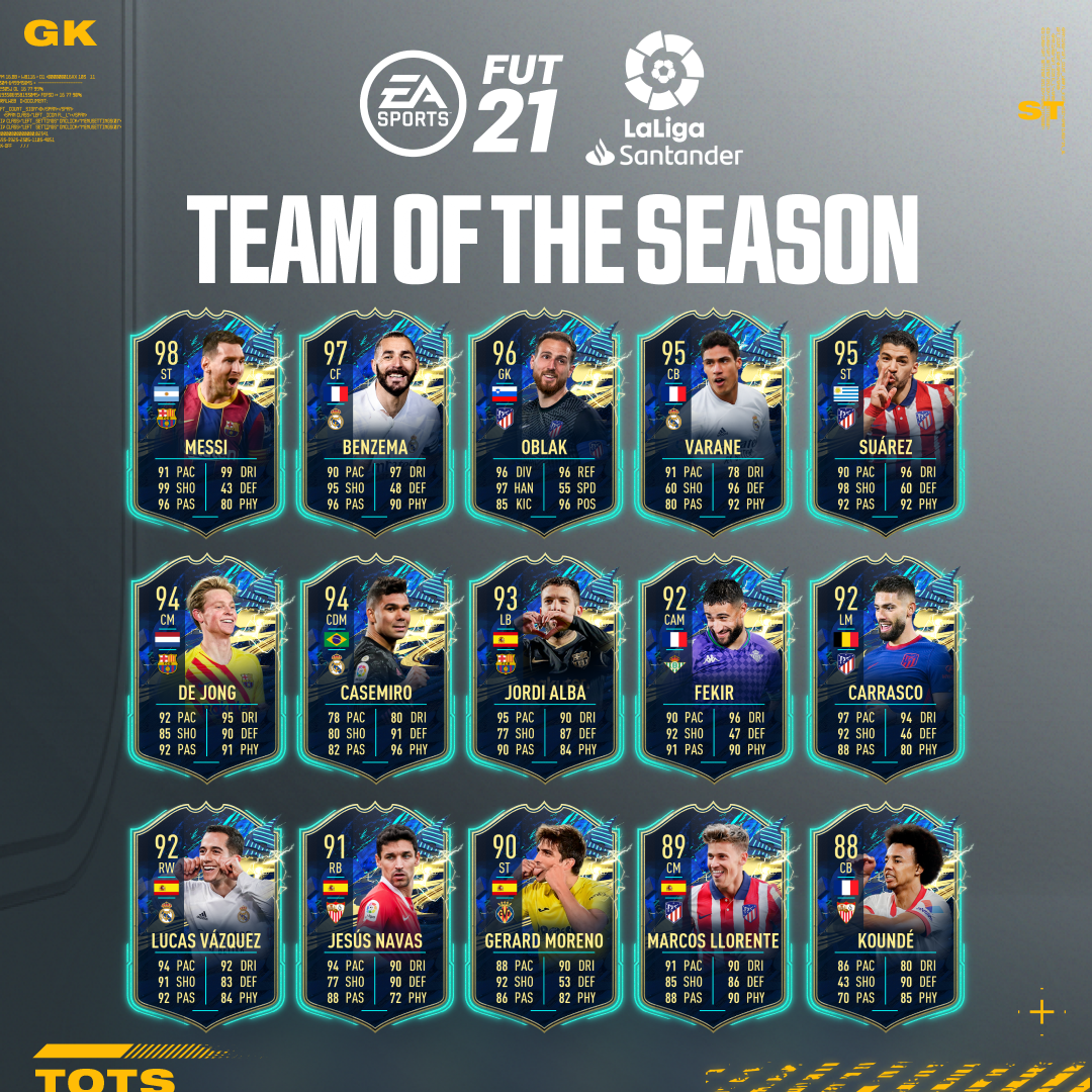 TOTS is a chance to look back at the season’s highs, goals, standouts and breakthroughs. It’s been a season like no other, with moments like no other. From standout saves, game-saving tackles and fire-hot strikes, the LaLiga Santander TOTS is a collection of this year’s very best players from all over the pitch.