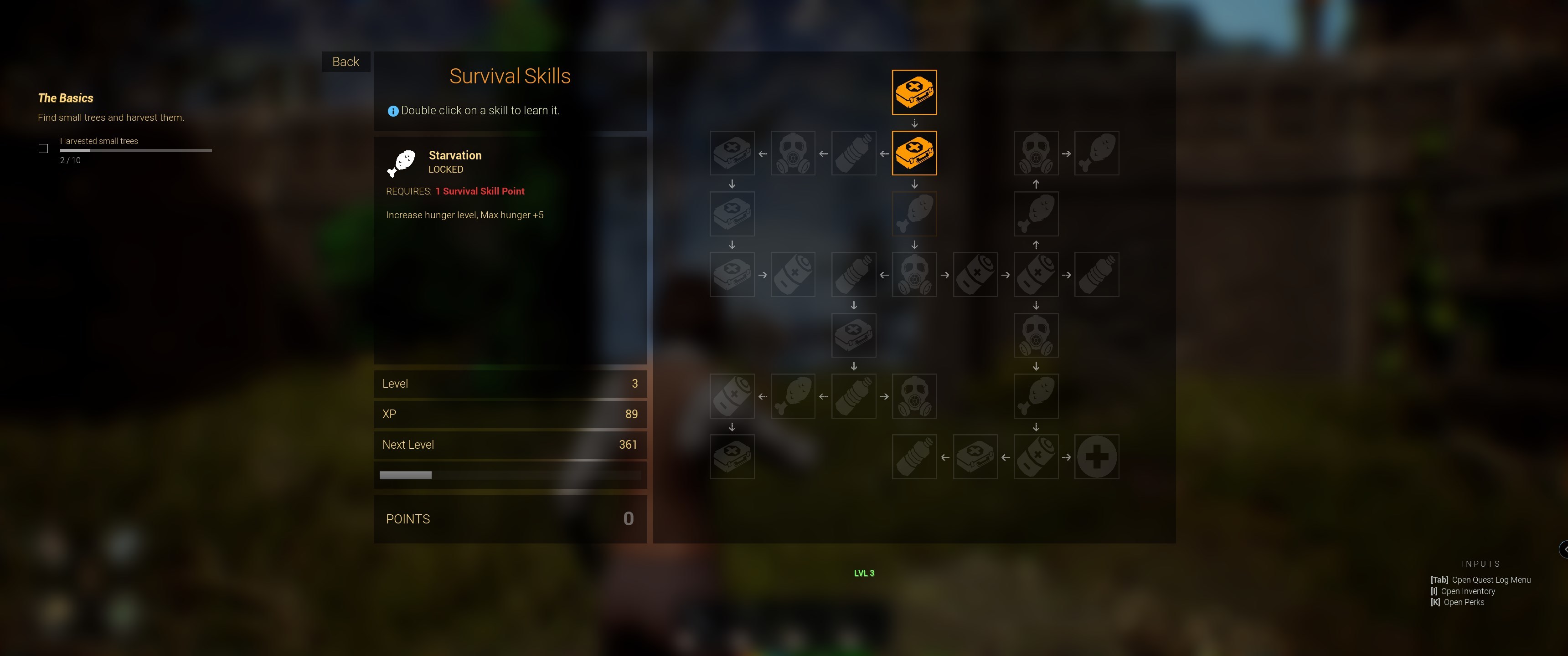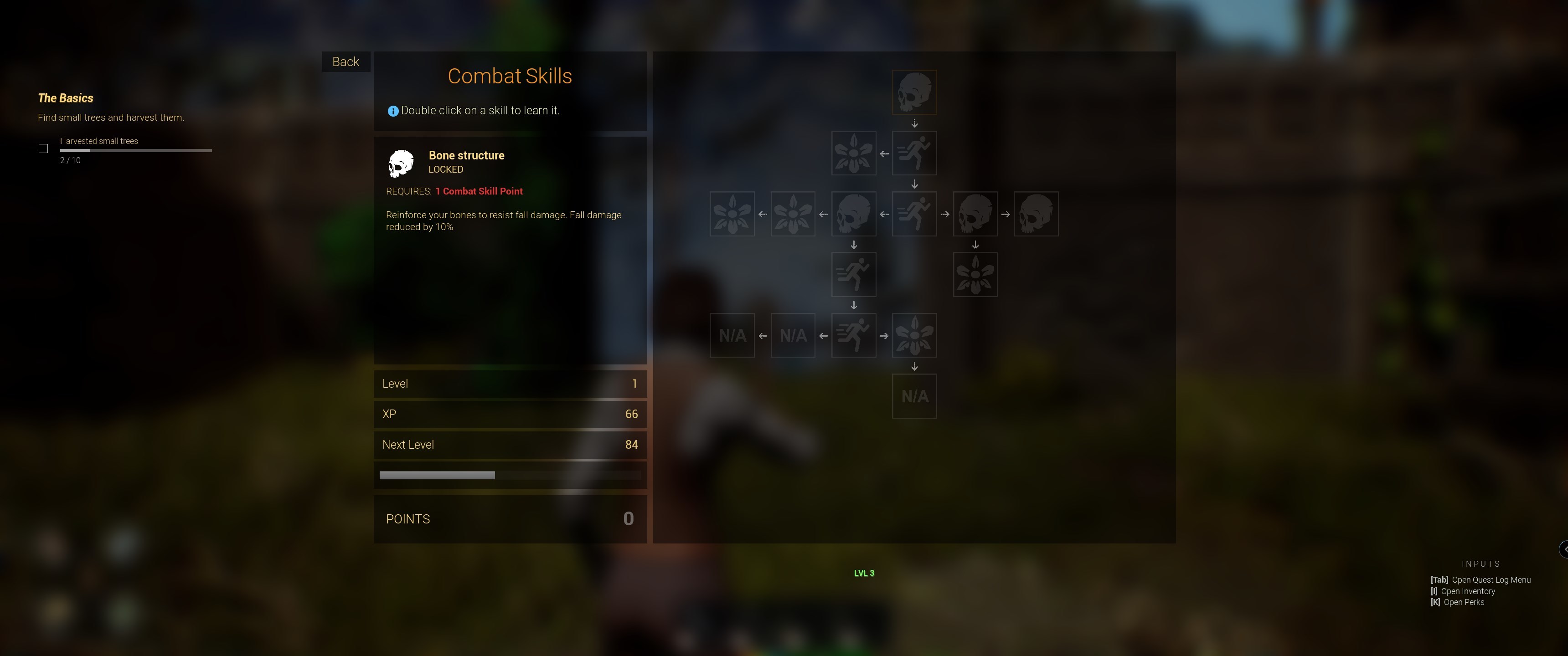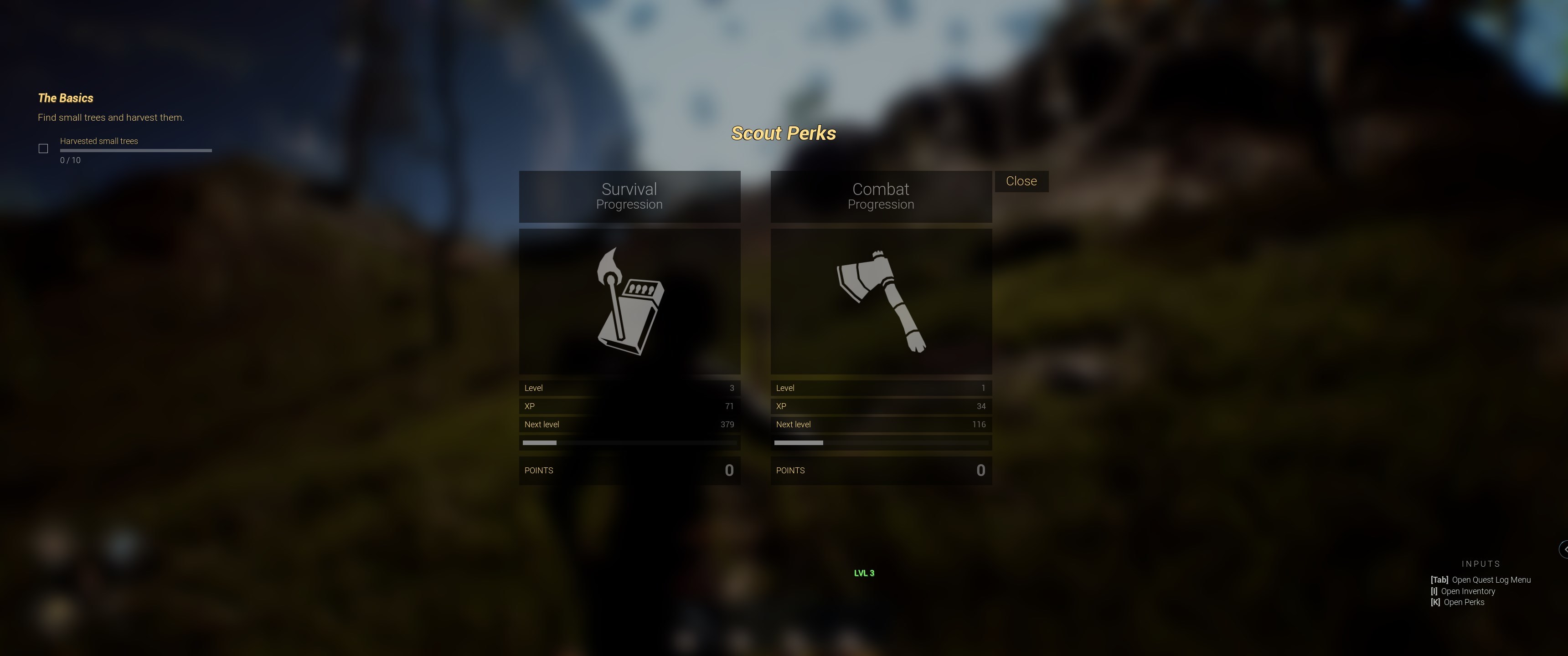 Survival and Combat perks system. Player level isn't tied with perk level. Perks system is opened with K (Default) Key, key information is also displayed at right bottom corner.