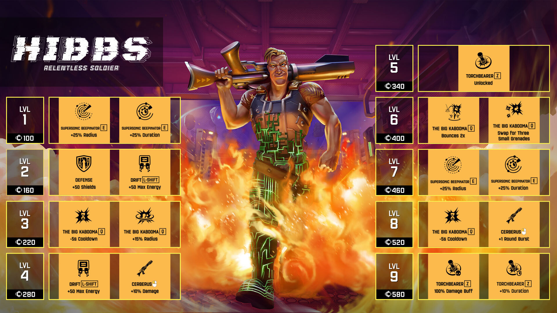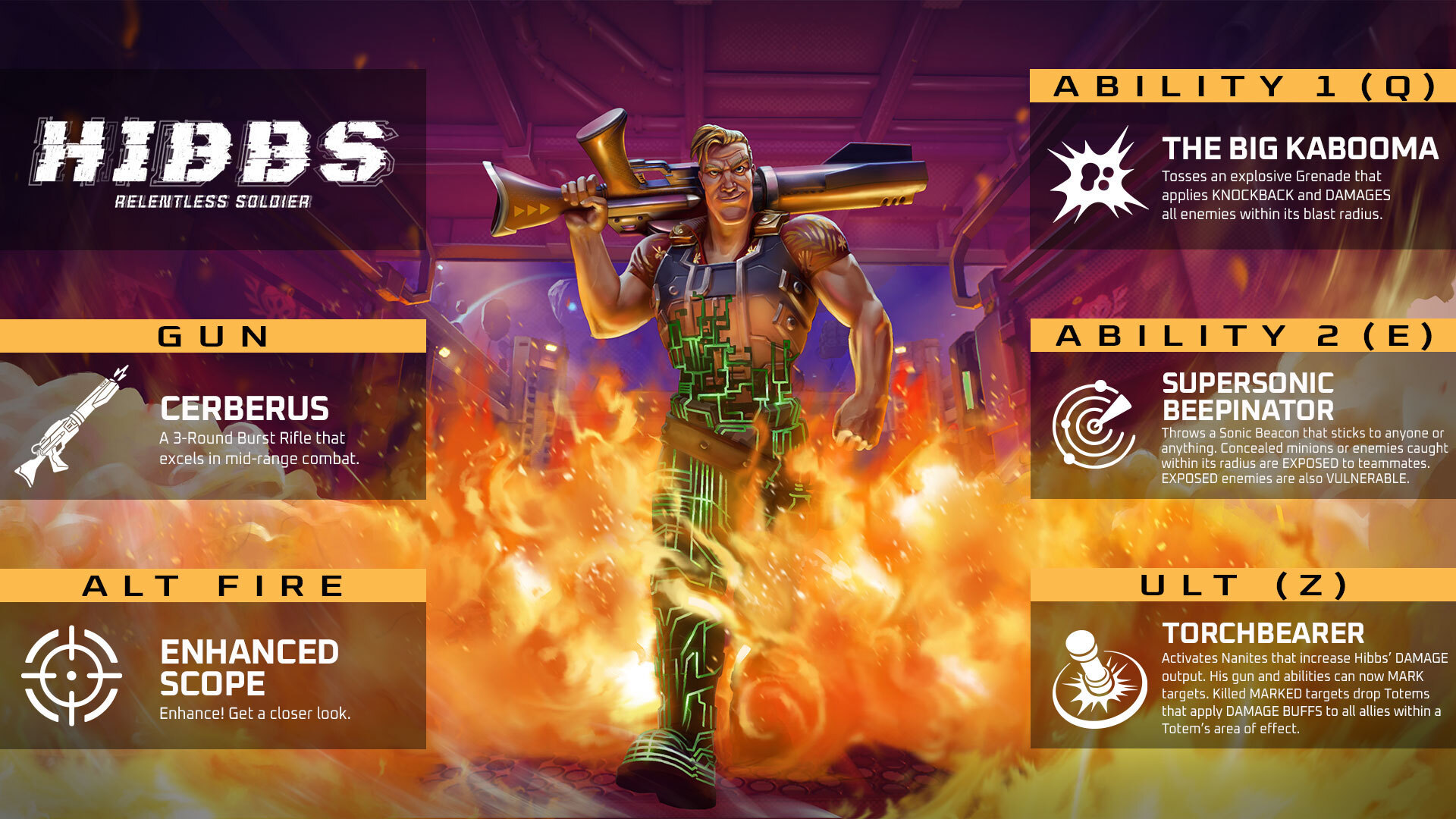 If you were part of the Open Beta, you’ve probably been expecting the return of our favorite nanite soldier, Hibbs. While Hibbs falls into much the same role as you may remember him, you’ll also probably be surprised at the number of changes he’s gone through. Previously, his kit leaned heavily into “lone wolf” play with self-sustaining abilities. These days, he’s a bit more of a team player whose damage output can become further augmented with abilities that buff his whole squad.