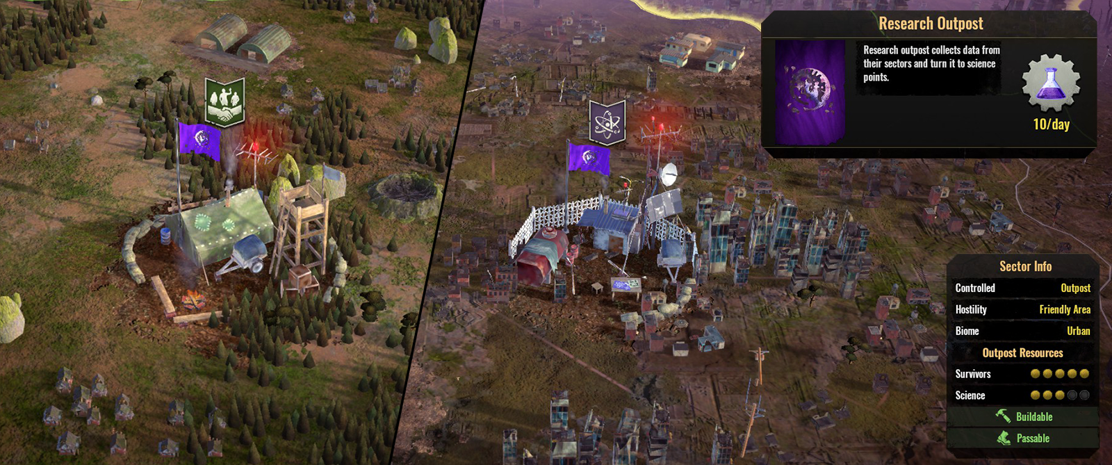 Two new types of Outposts have been added to the game. The first type is the Research Outpost. - This outpost will produce Science Points on a daily basis that are automatically added to the colony’s amount of Science Points. - The effectiveness of the Research Outpost is based on the biome of the sector and the amount of Science locations in the sector. You can spot these locations by the floaters on top of them.