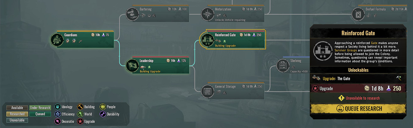 Technologies can be now queued within a single category. For example, if you want to rush for Reinforced Gate, you can queue it to have your colonists tackle all the prerequisite techs first and your chosen tech right after without additional input. You’re then free to manage your colony without having to return to the tech tree after each new discovery. You can also reset the queue if research priorities change.