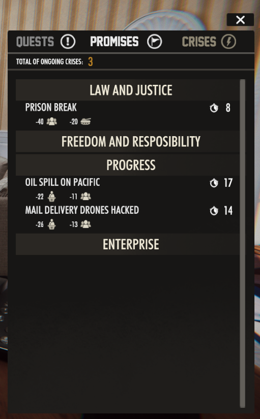 A crisis can continuously bring down the statistics you worked so hard to improve. The crises can affect everything and everyone around you – your public image, your citizens’ well-being, your cabinet, and the overall condition of the country. The longer a crisis lasts, the more your ratings suffer. And if you allow for that to happen… The Oval Office may soon change its occupant. To make sure you keep your spot in the White House, you better make sure to employ proper counteractions, either by funding specific projects or making sure to never neglect the signing of appropriate legislations.
